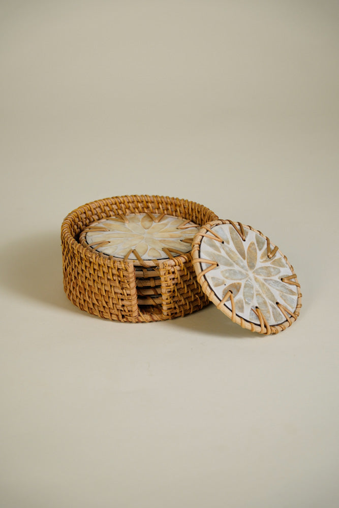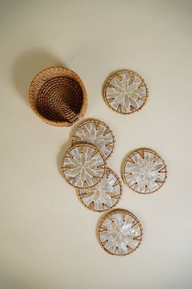 Capiz Coaster Rattan with Case Floral White Set of 6