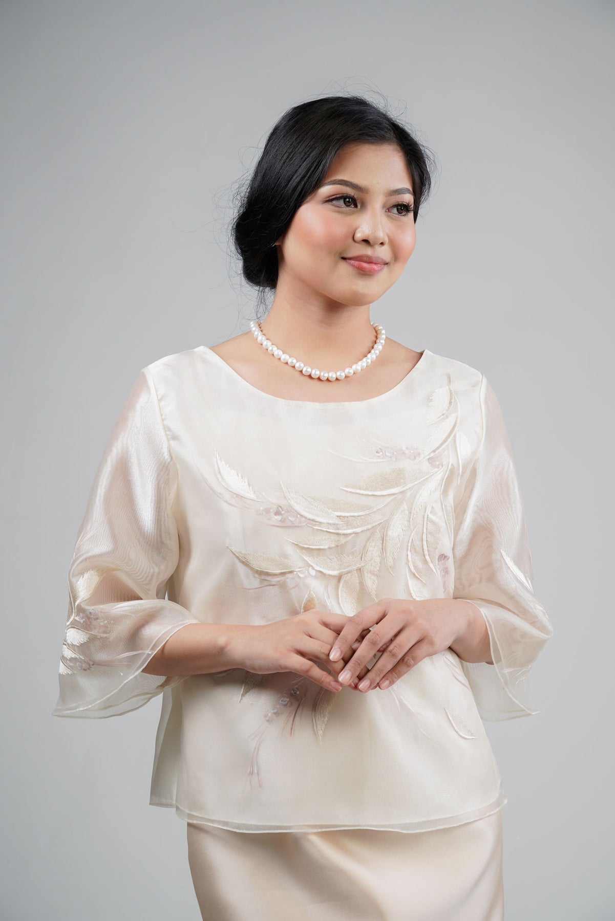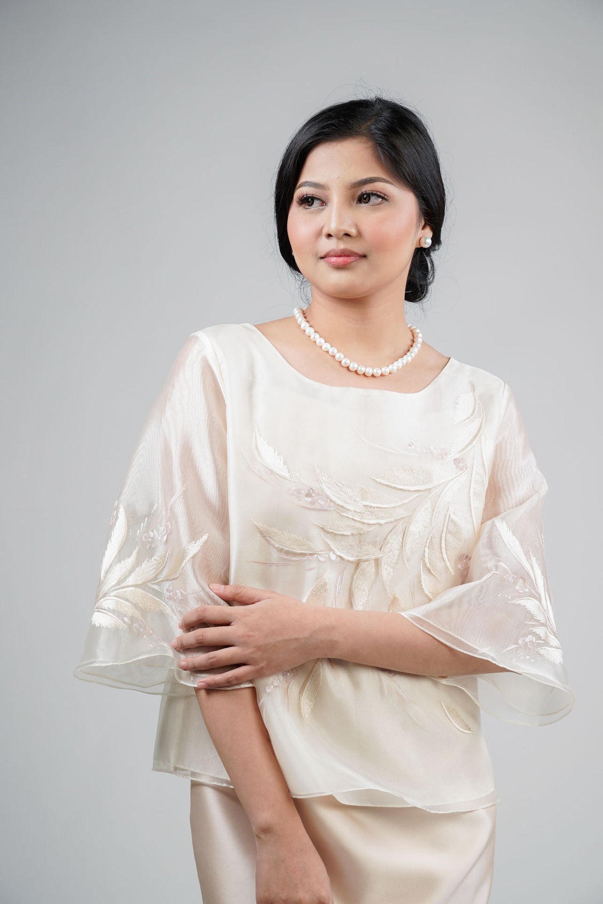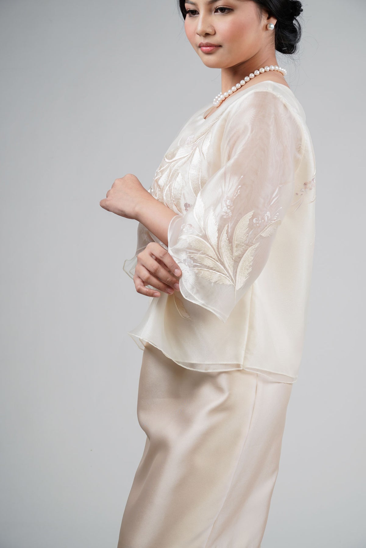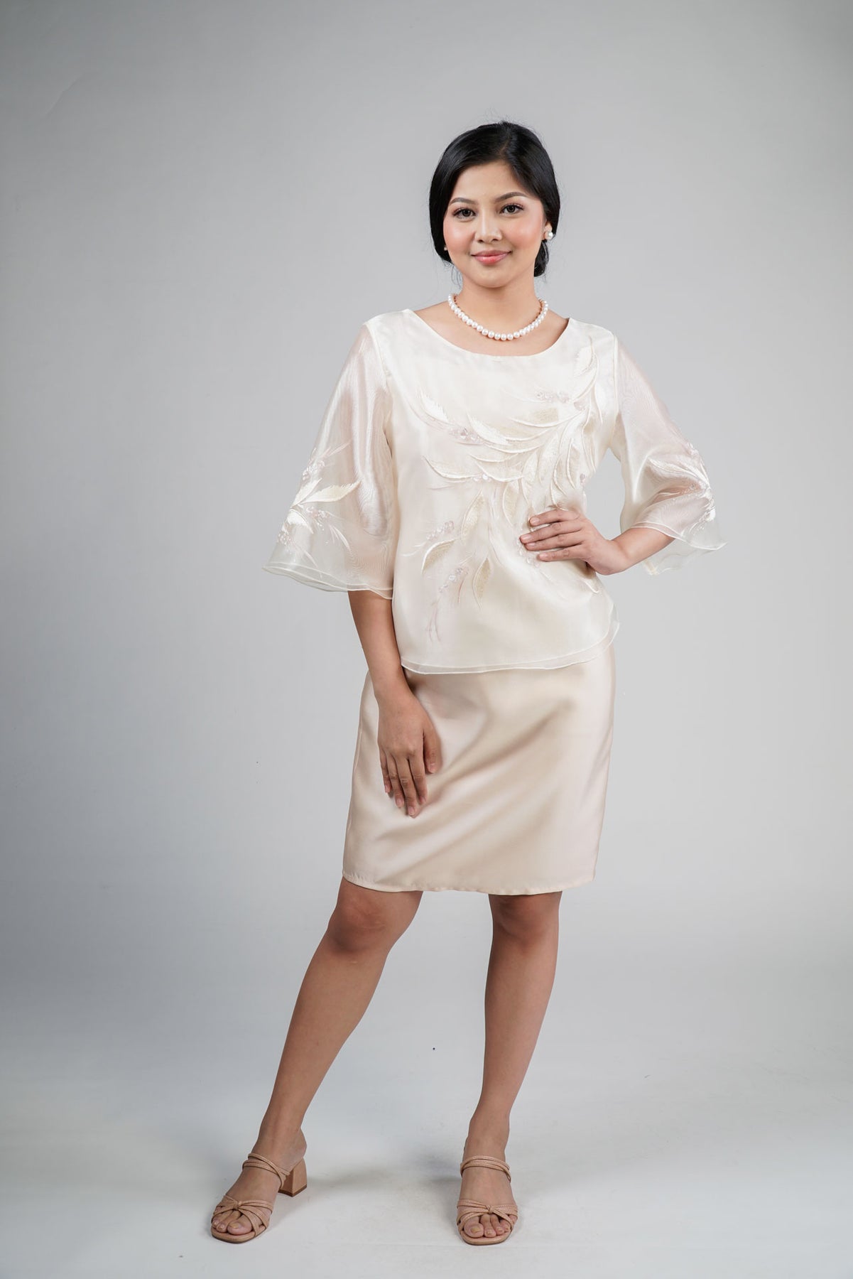 I wore the ivory colored shanthng dress during my wedding day! It was form fitting and had a nice hug at the waist area. Dress is not heavy, and I had comfort wearing it the whole day. Gown was long, as I stand 5'1", I wore a 3in heels and the hem falls slightly touching the floor.