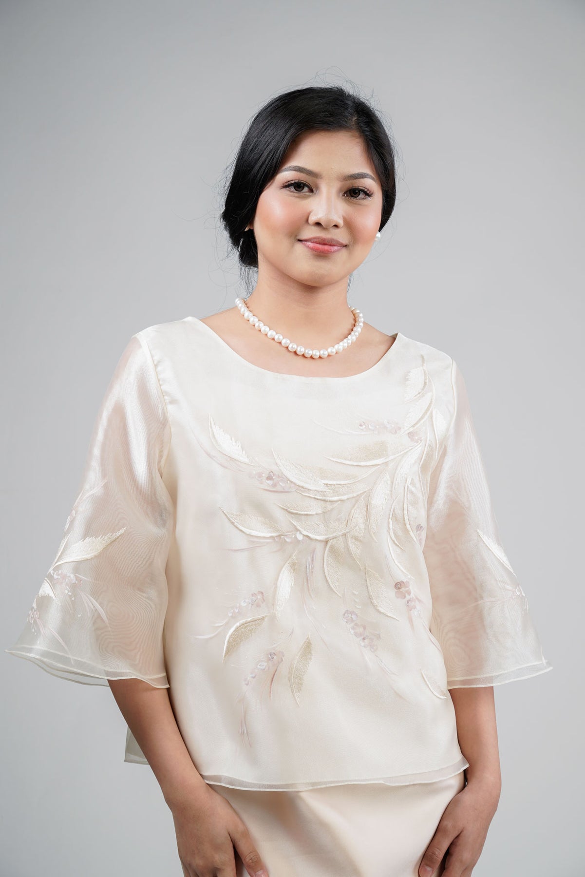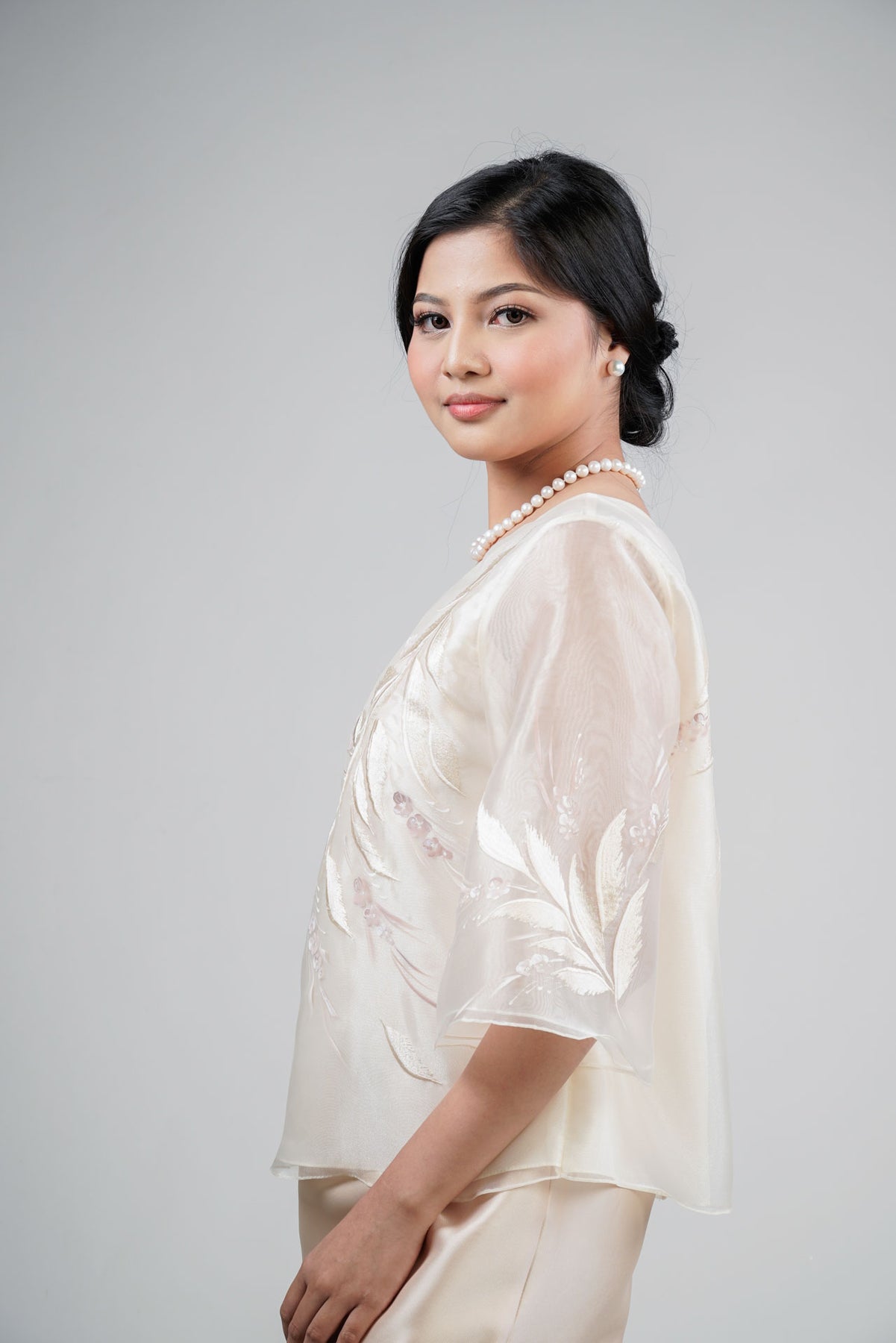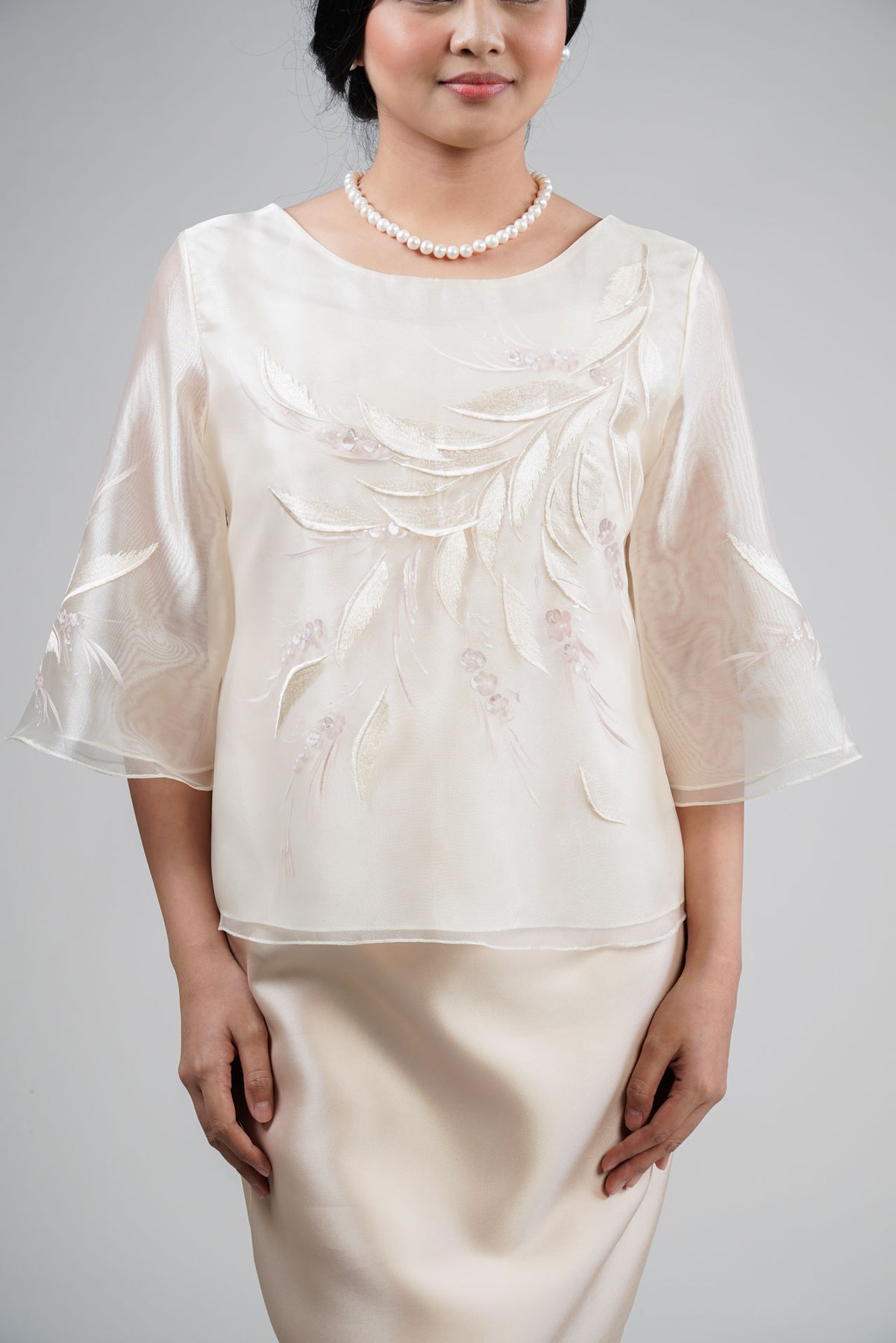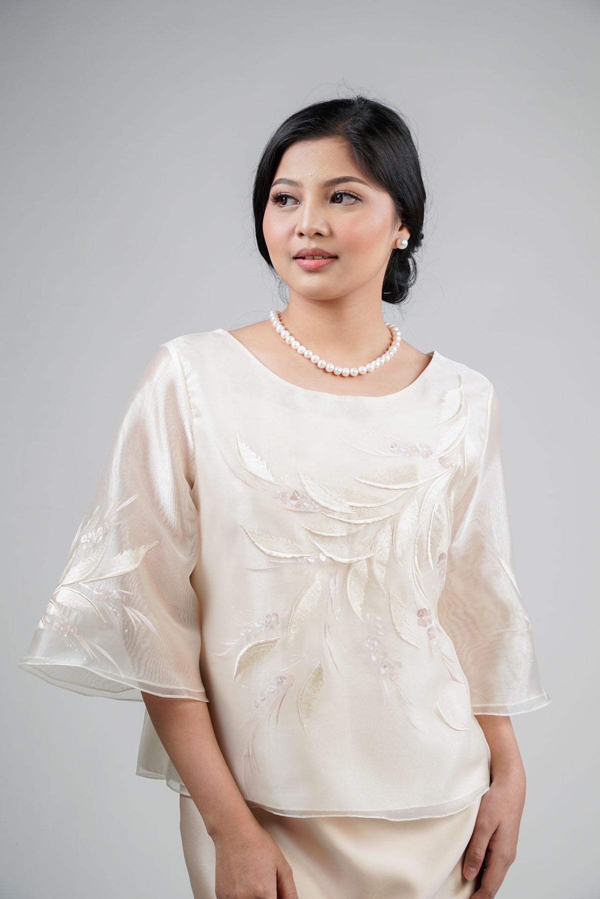 I wore the ivory colored shanthng dress during my wedding day! It was form fitting and had a nice hug at the waist area. Dress is not heavy, and I had comfort wearing it the whole day. Gown was long, as I stand 5'1", I wore a 3in heels and the hem falls slightly touching the floor.