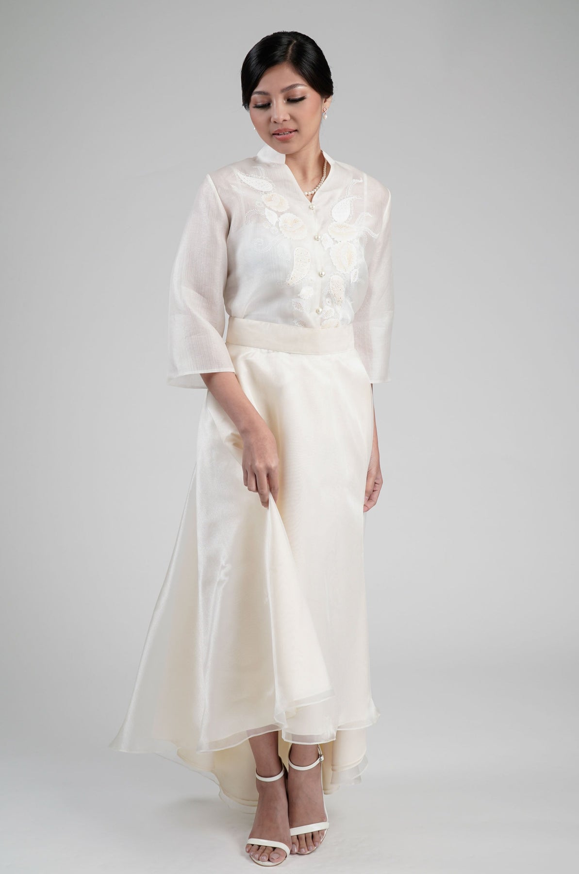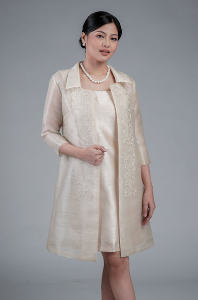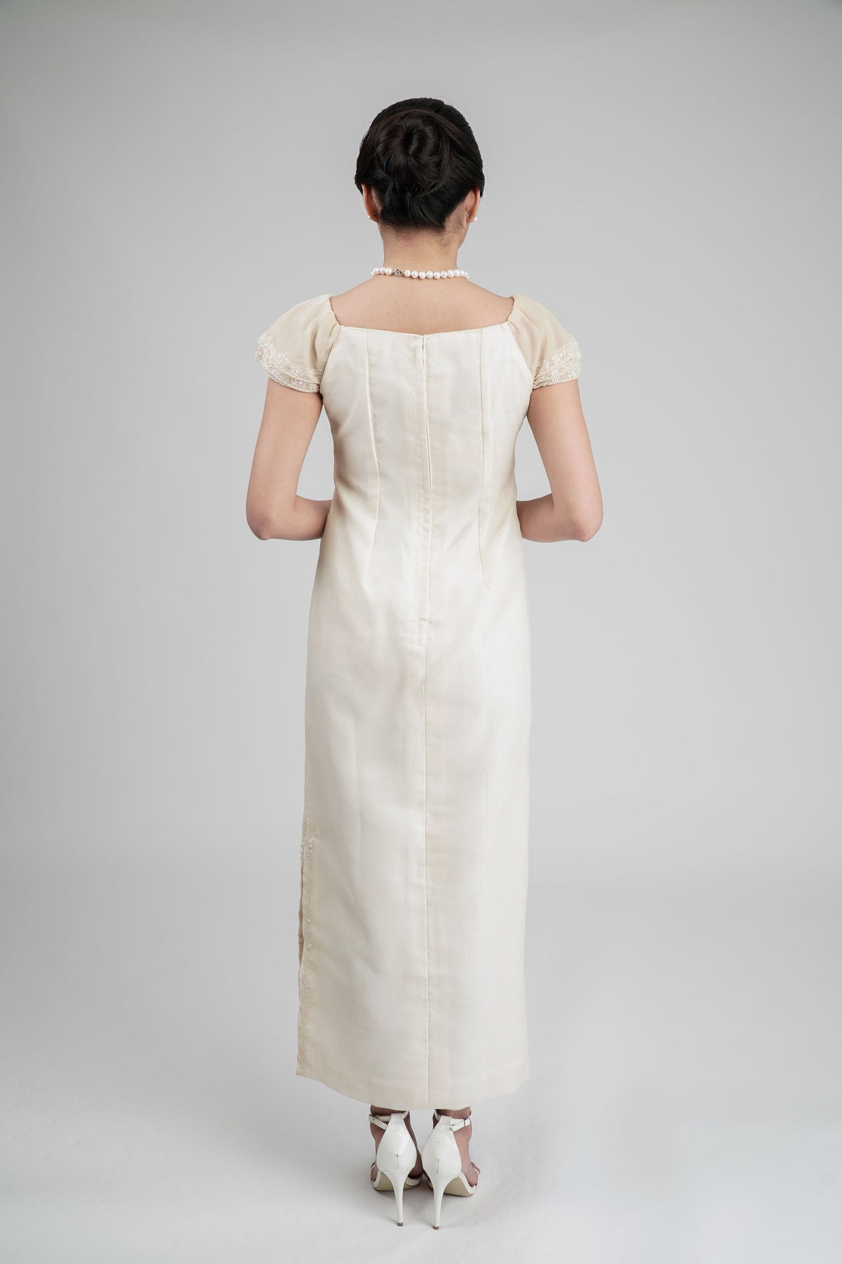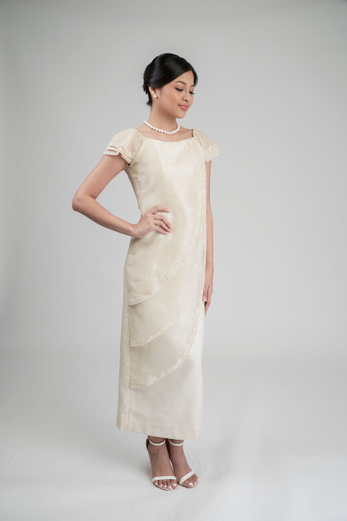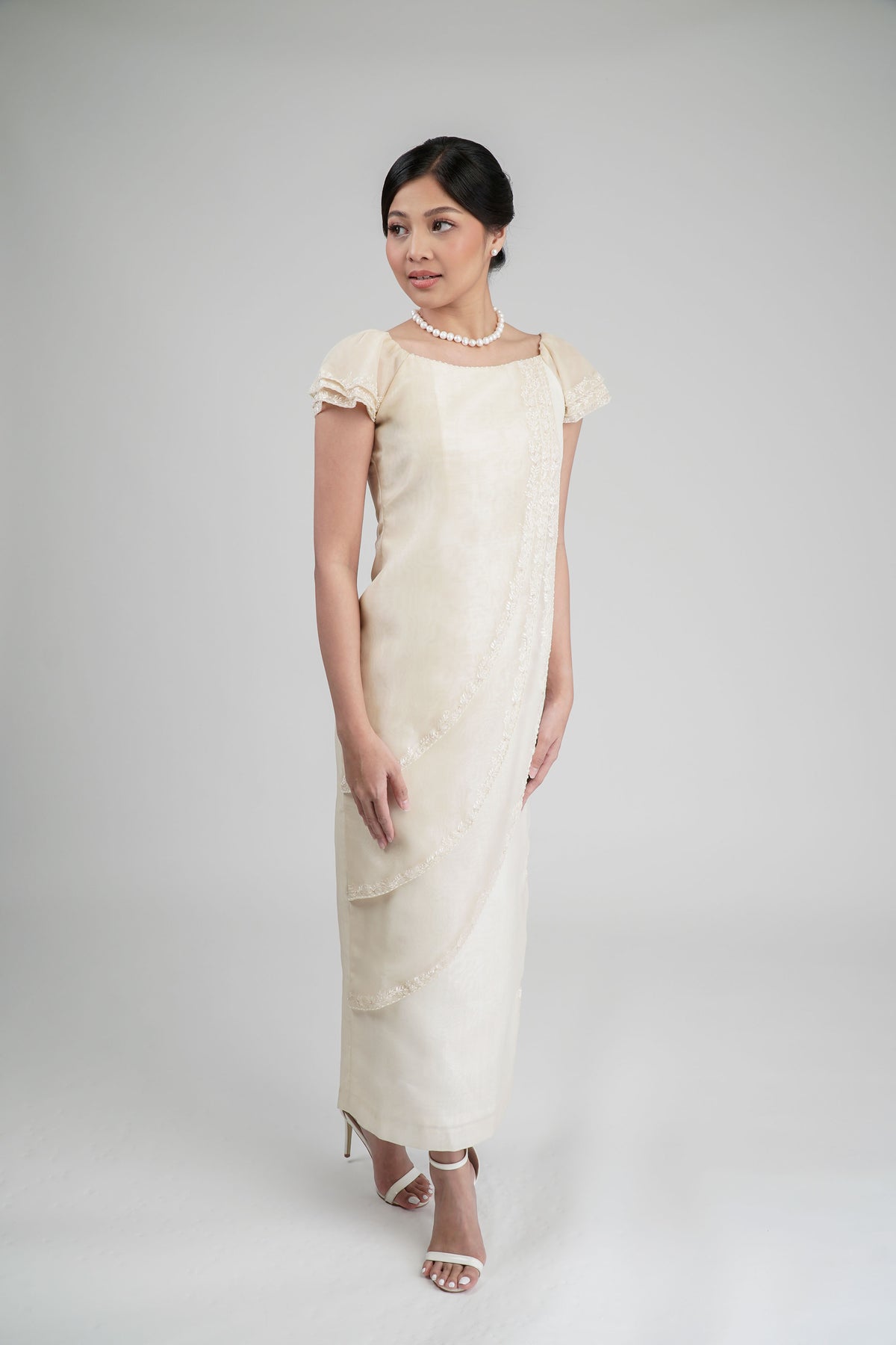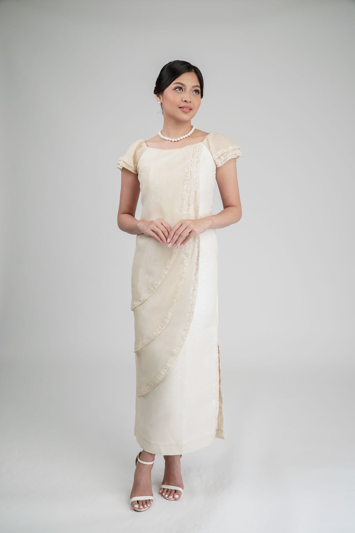 I wore the ivory colored shanthng dress during my wedding day! It was form fitting and had a nice hug at the waist area. Dress is not heavy, and I had comfort wearing it the whole day. Gown was long, as I stand 5'1", I wore a 3in heels and the hem falls slightly touching the floor.