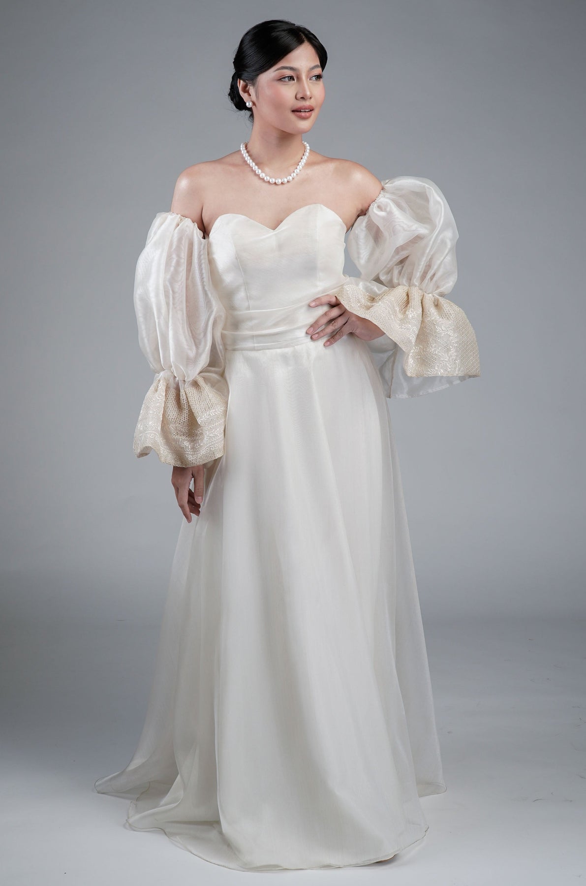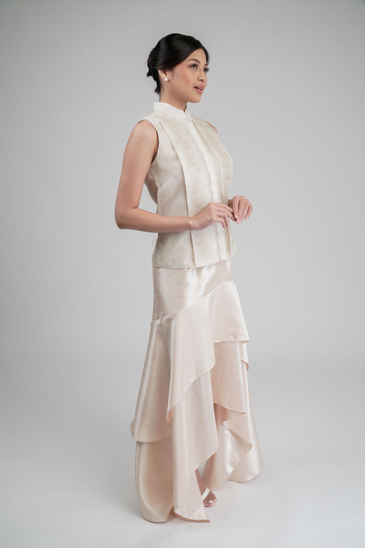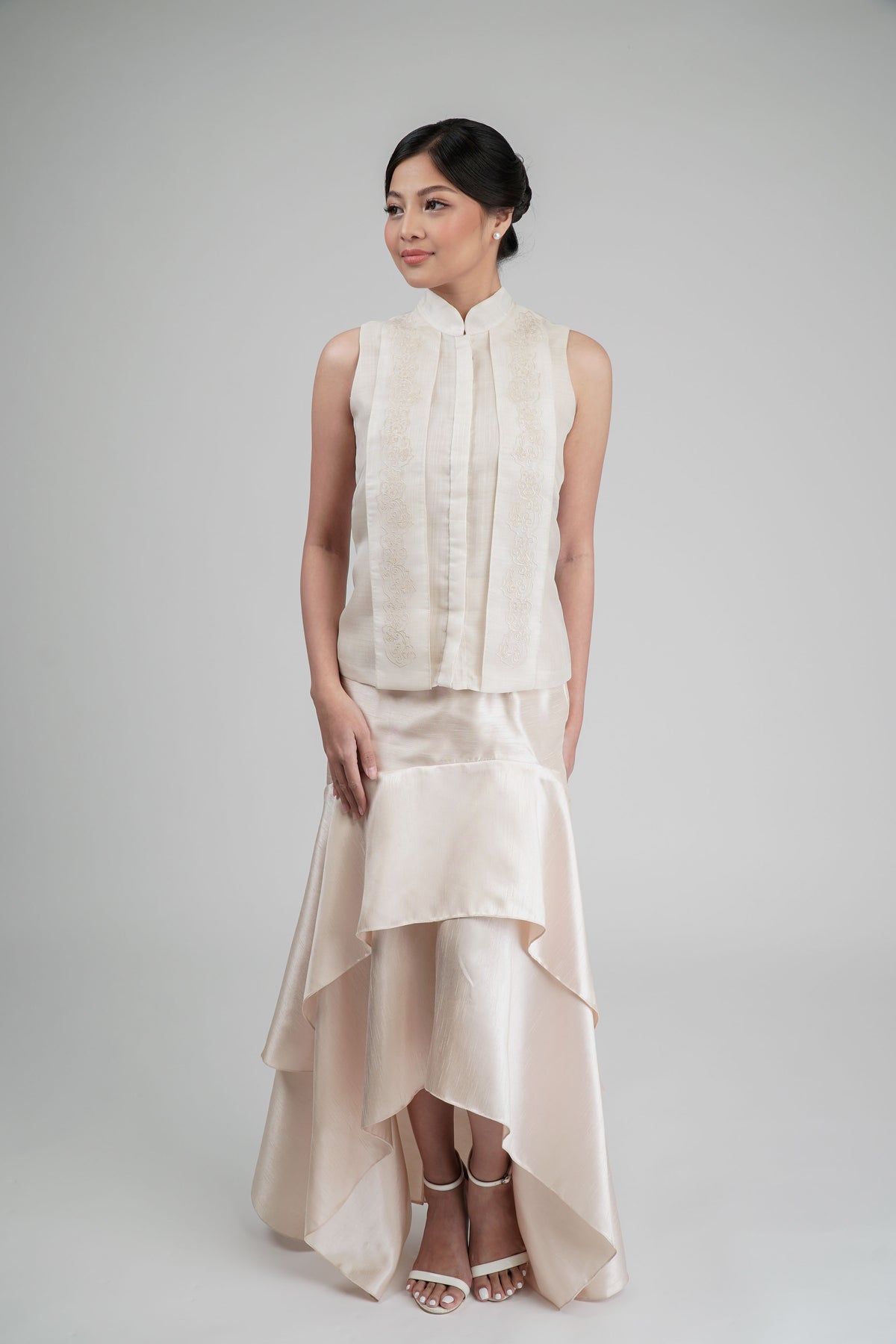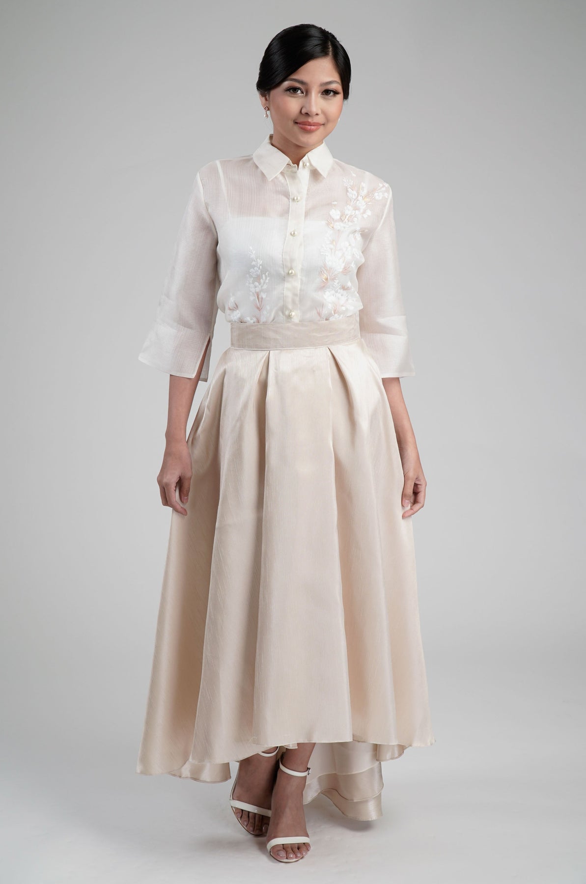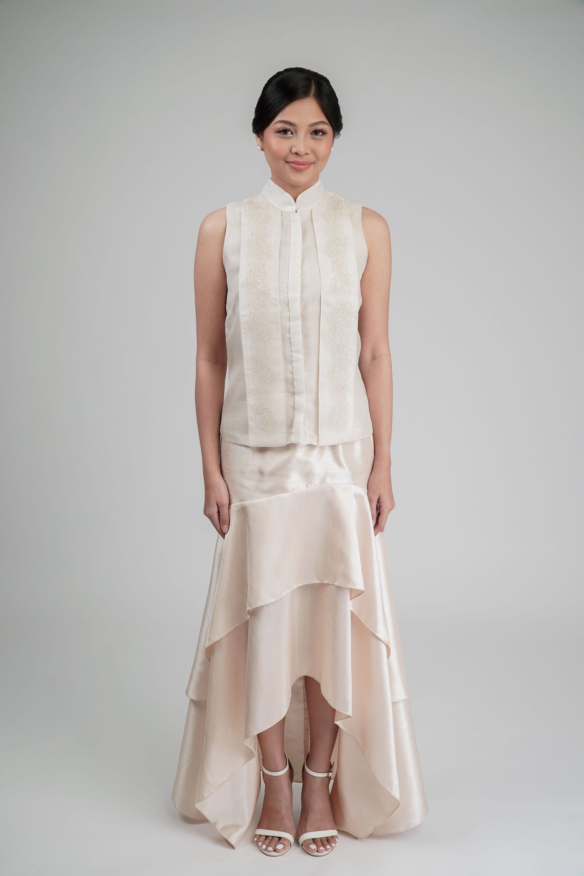I wore the ivory colored shanthng dress during my wedding day! It was form fitting and had a nice hug at the waist area. Dress is not heavy, and I had comfort wearing it the whole day. Gown was long, as I stand 5'1", I wore a 3in heels and the hem falls slightly touching the floor.