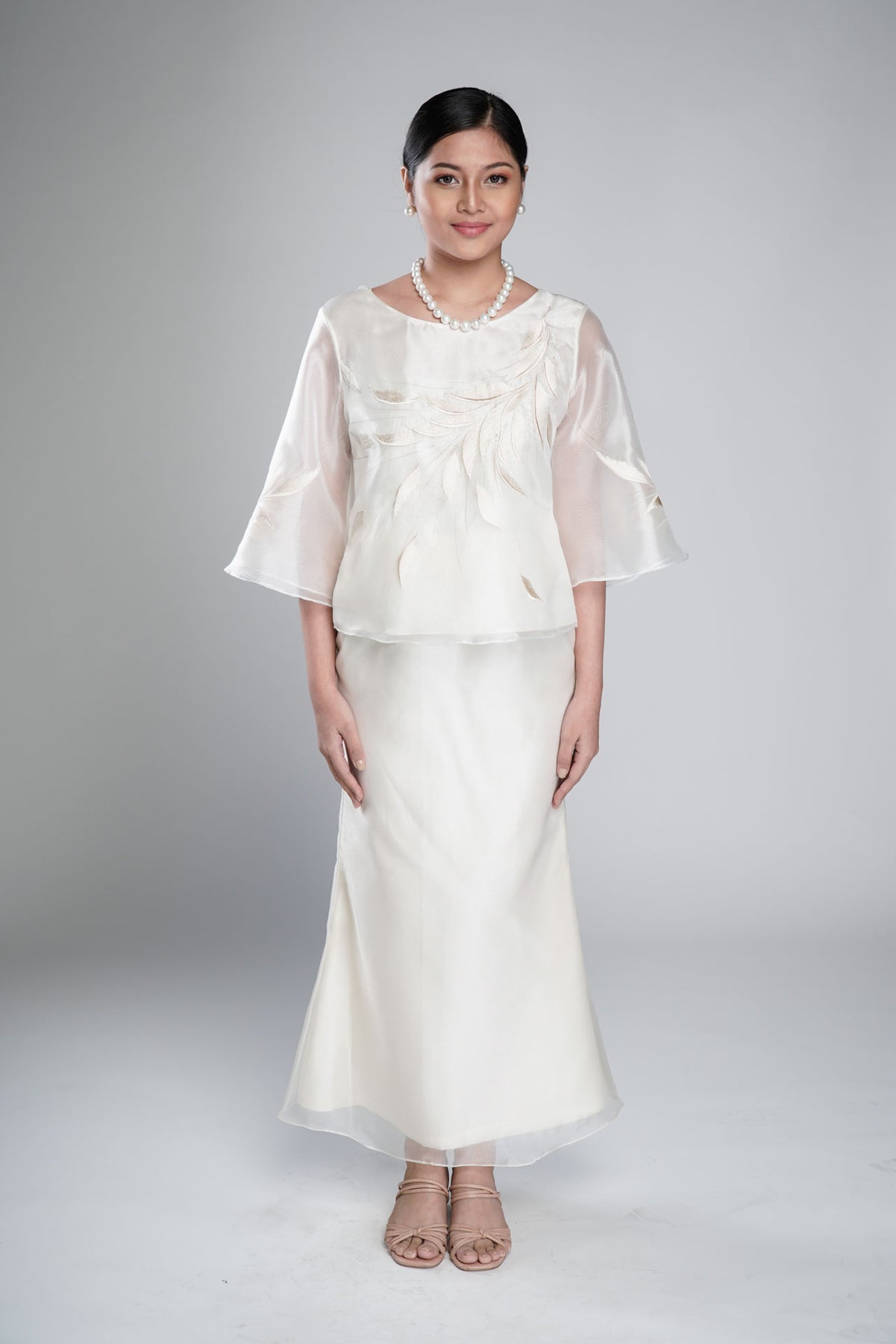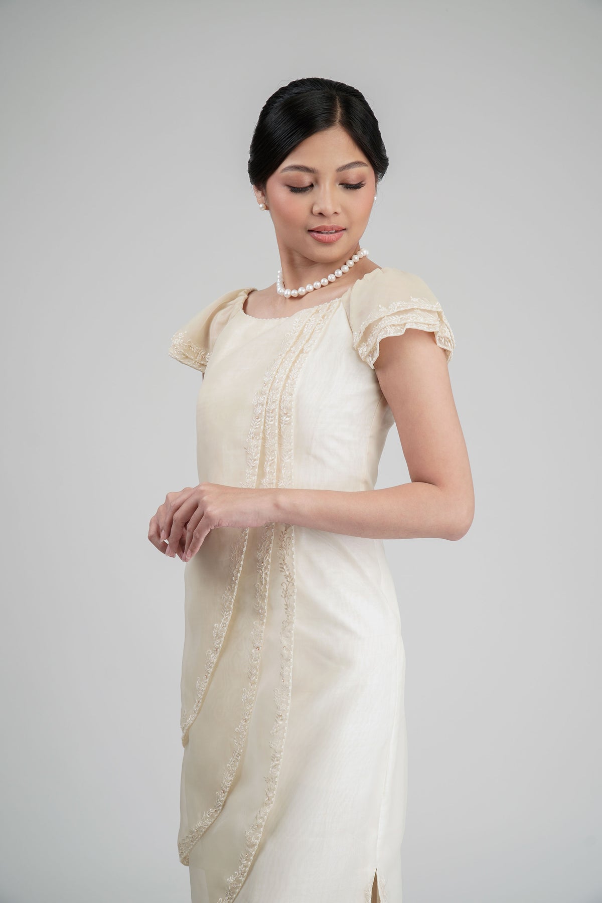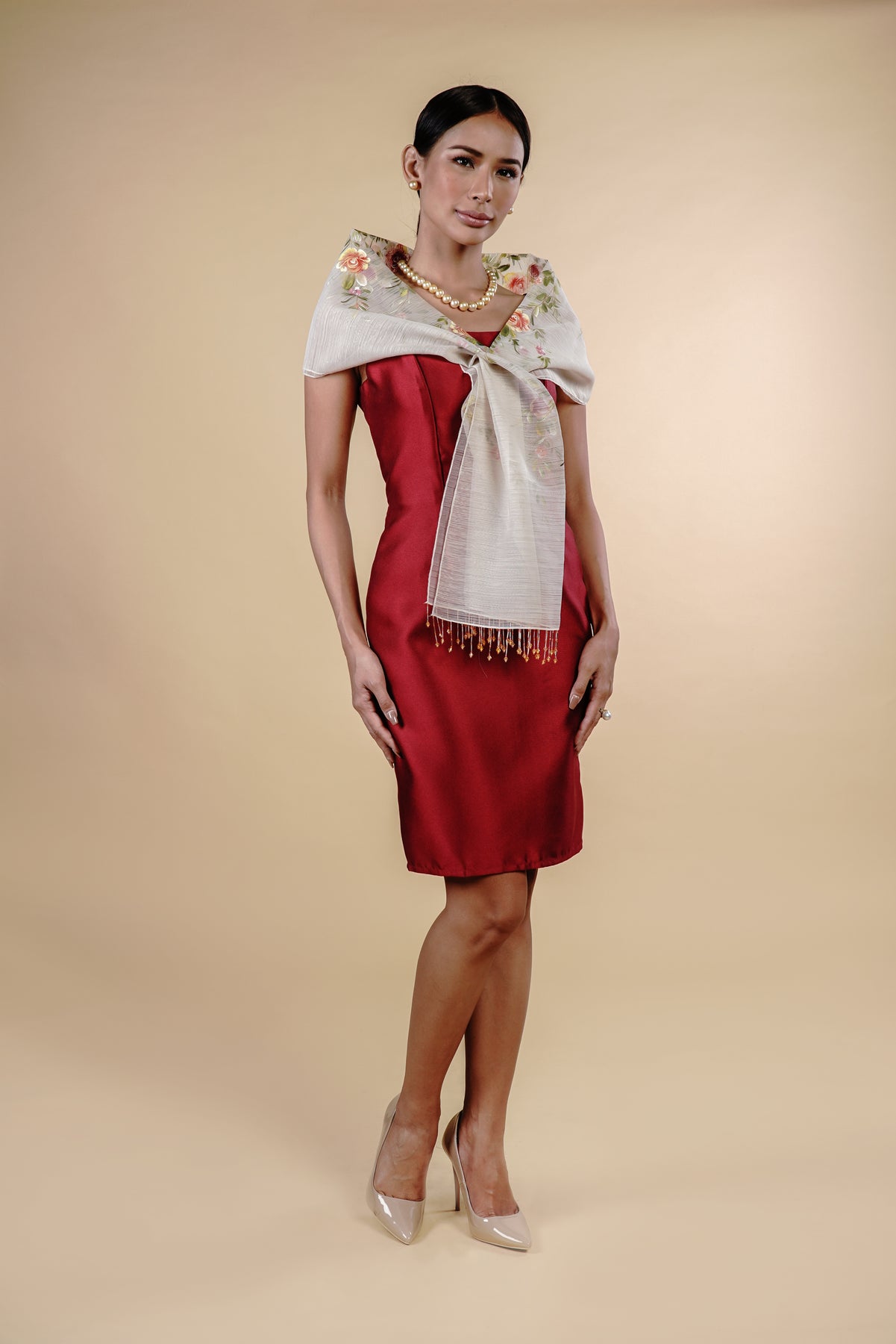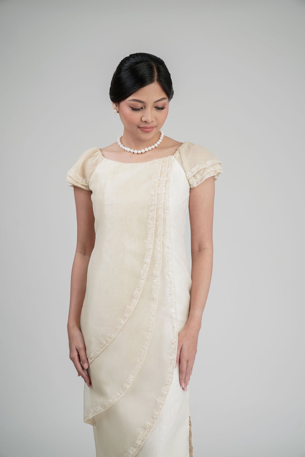 I wore the ivory colored shanthng dress during my wedding day! It was form fitting and had a nice hug at the waist area. Dress is not heavy, and I had comfort wearing it the whole day. Gown was long, as I stand 5'1", I wore a 3in heels and the hem falls slightly touching the floor.