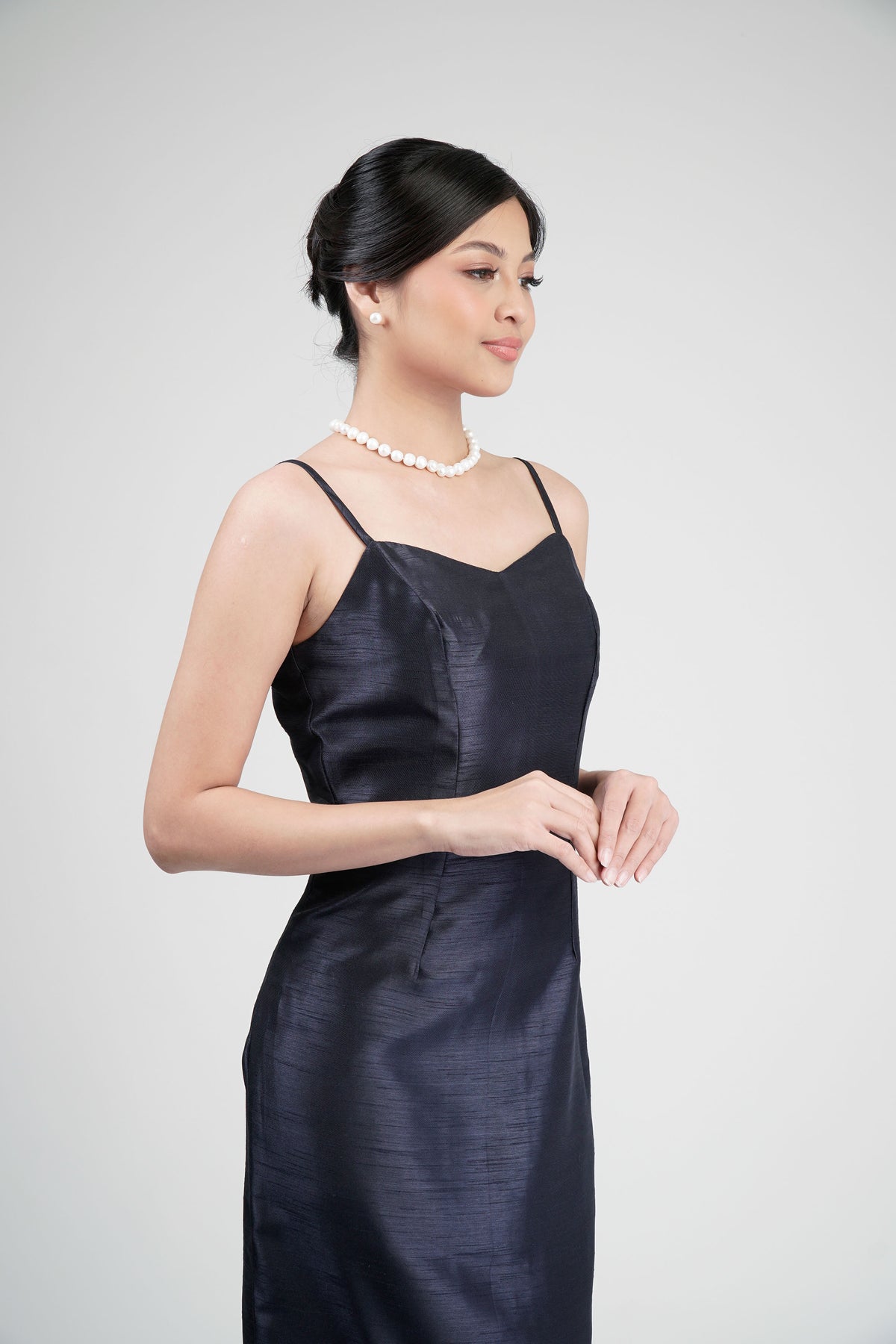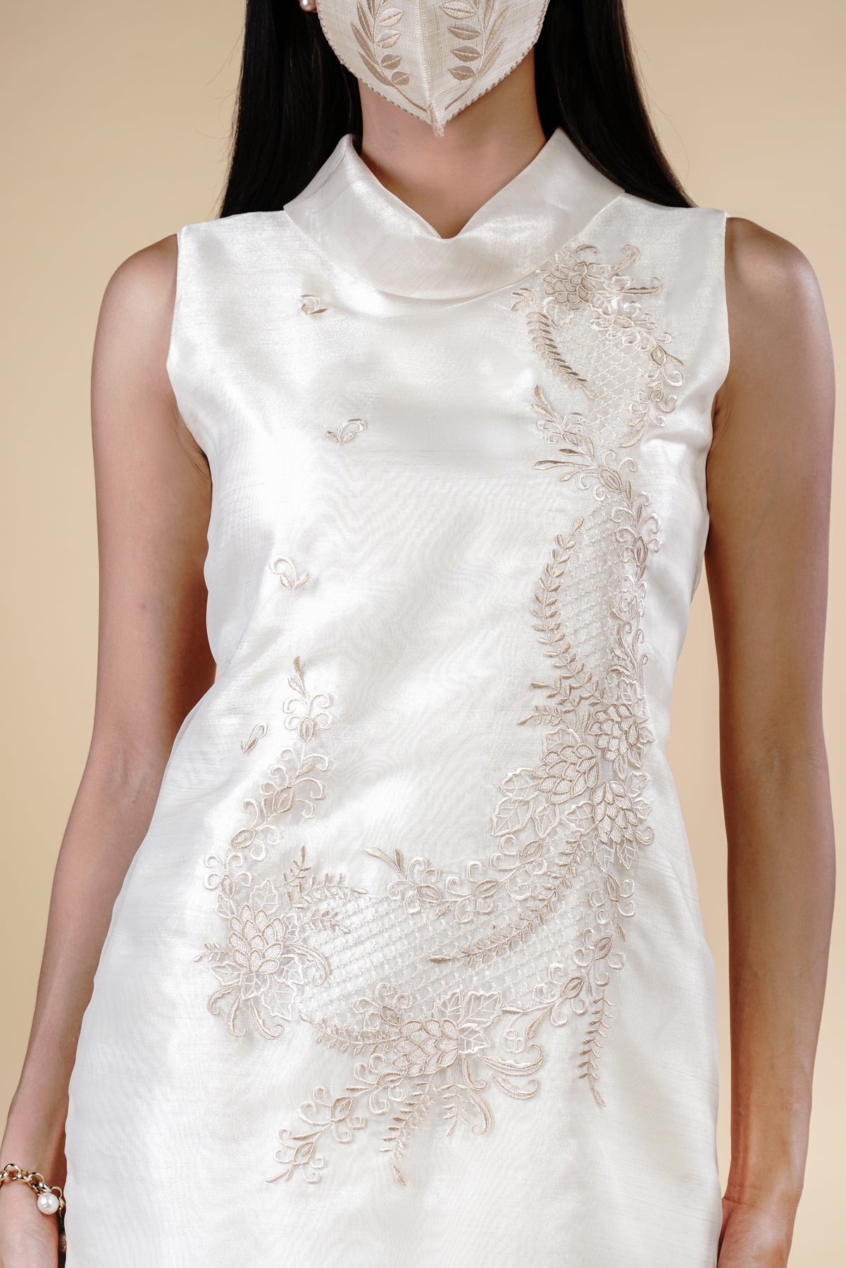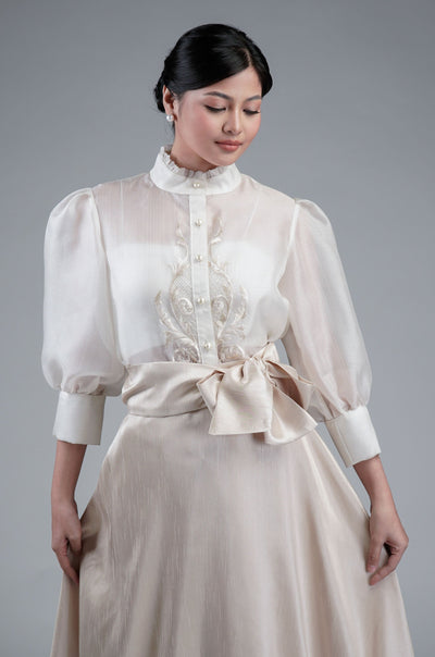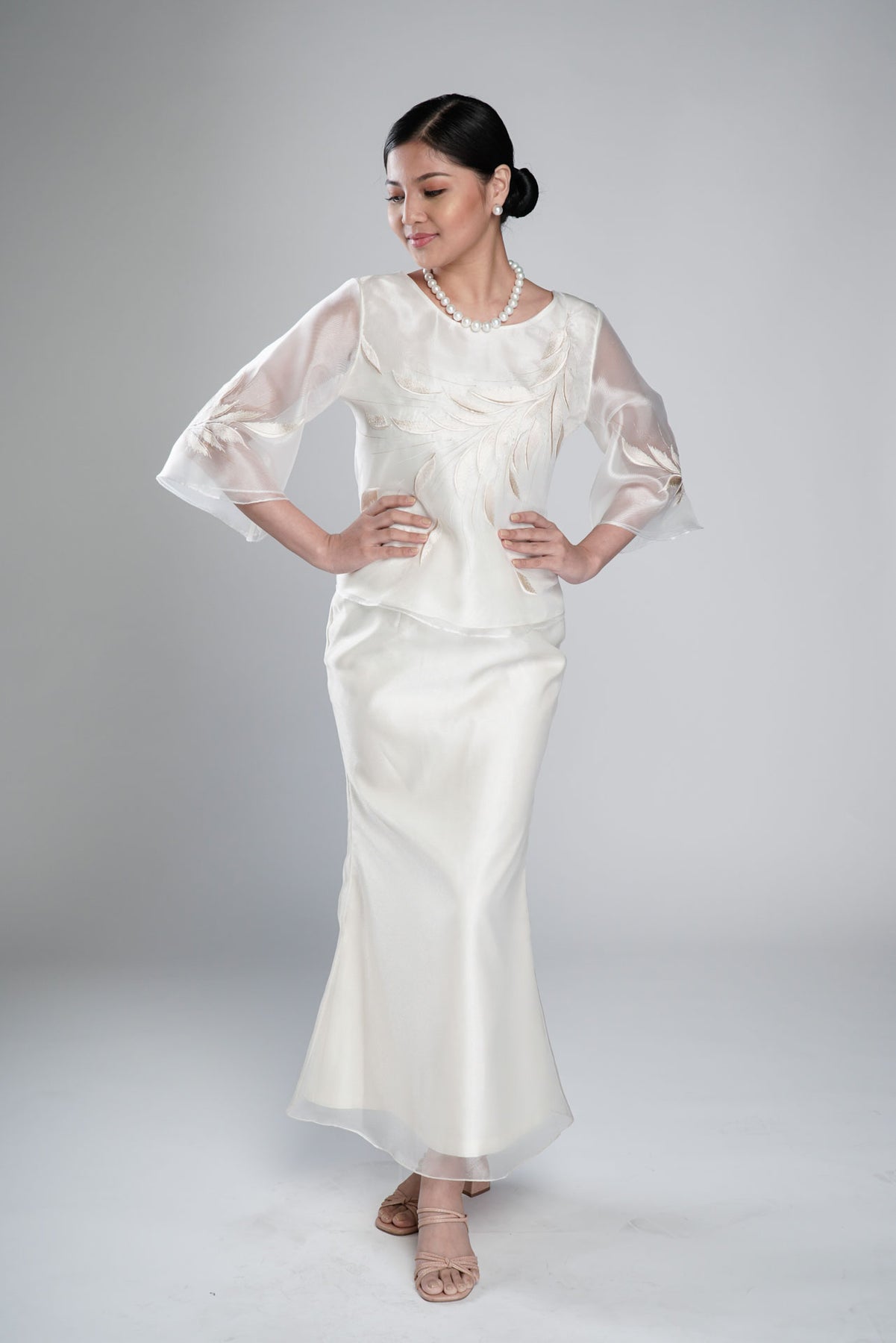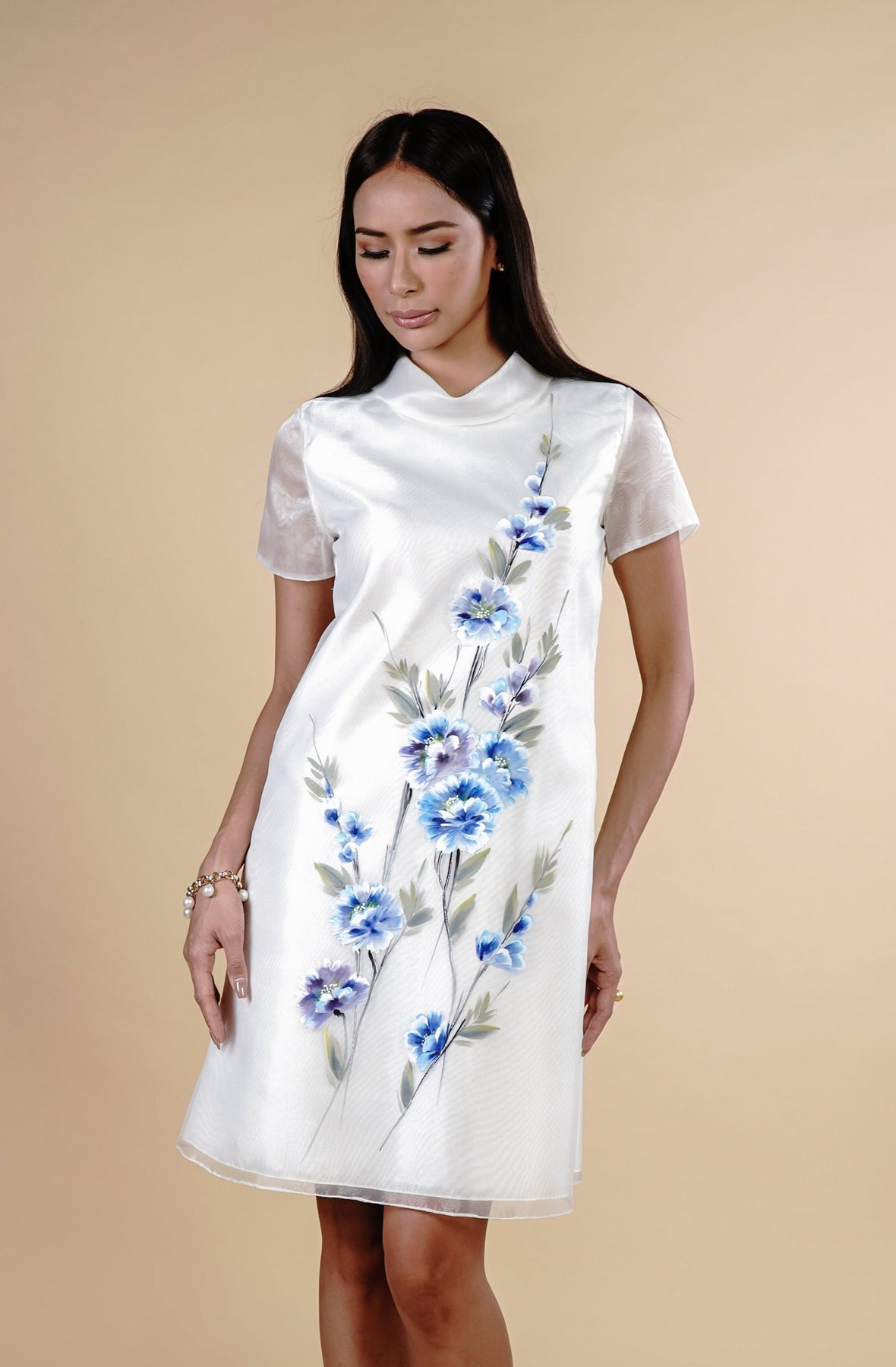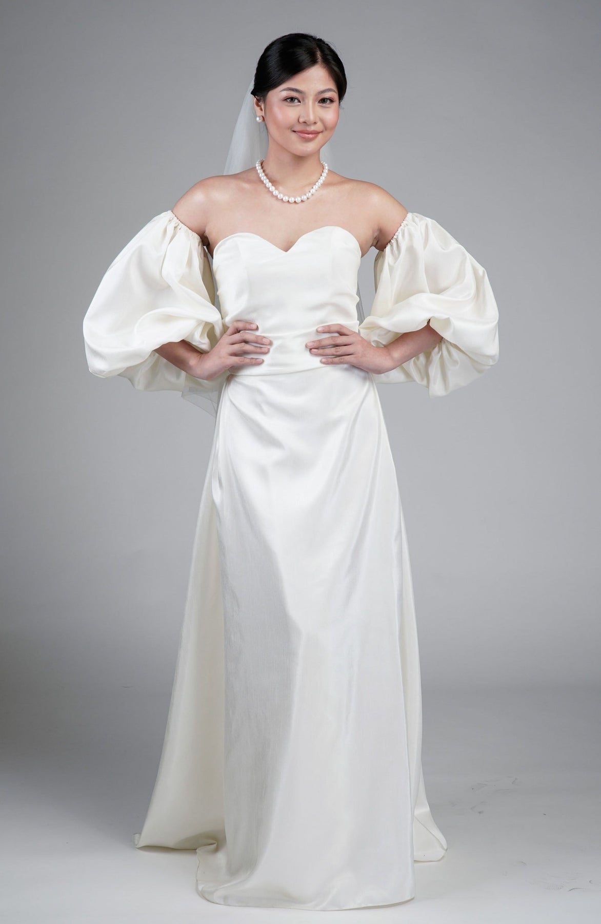 I wore the ivory colored shanthng dress during my wedding day! It was form fitting and had a nice hug at the waist area. Dress is not heavy, and I had comfort wearing it the whole day. Gown was long, as I stand 5'1", I wore a 3in heels and the hem falls slightly touching the floor.