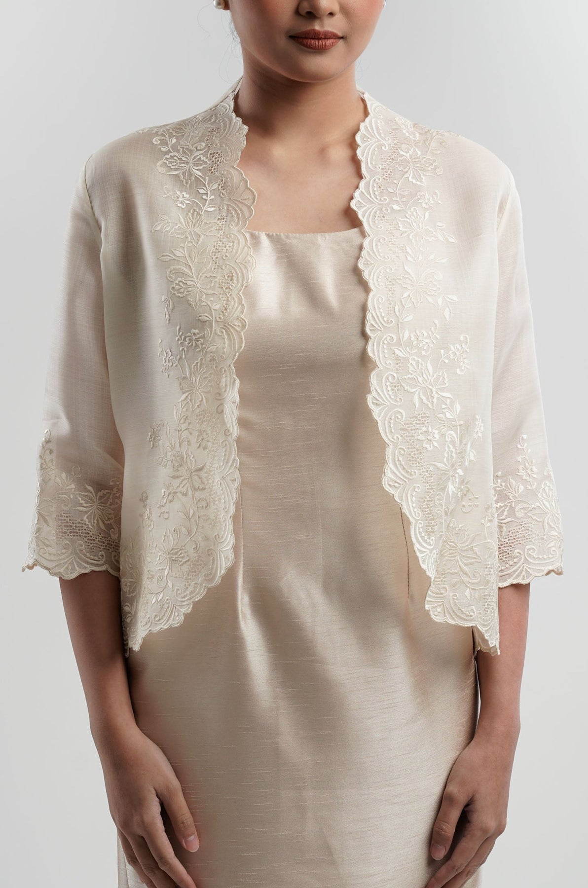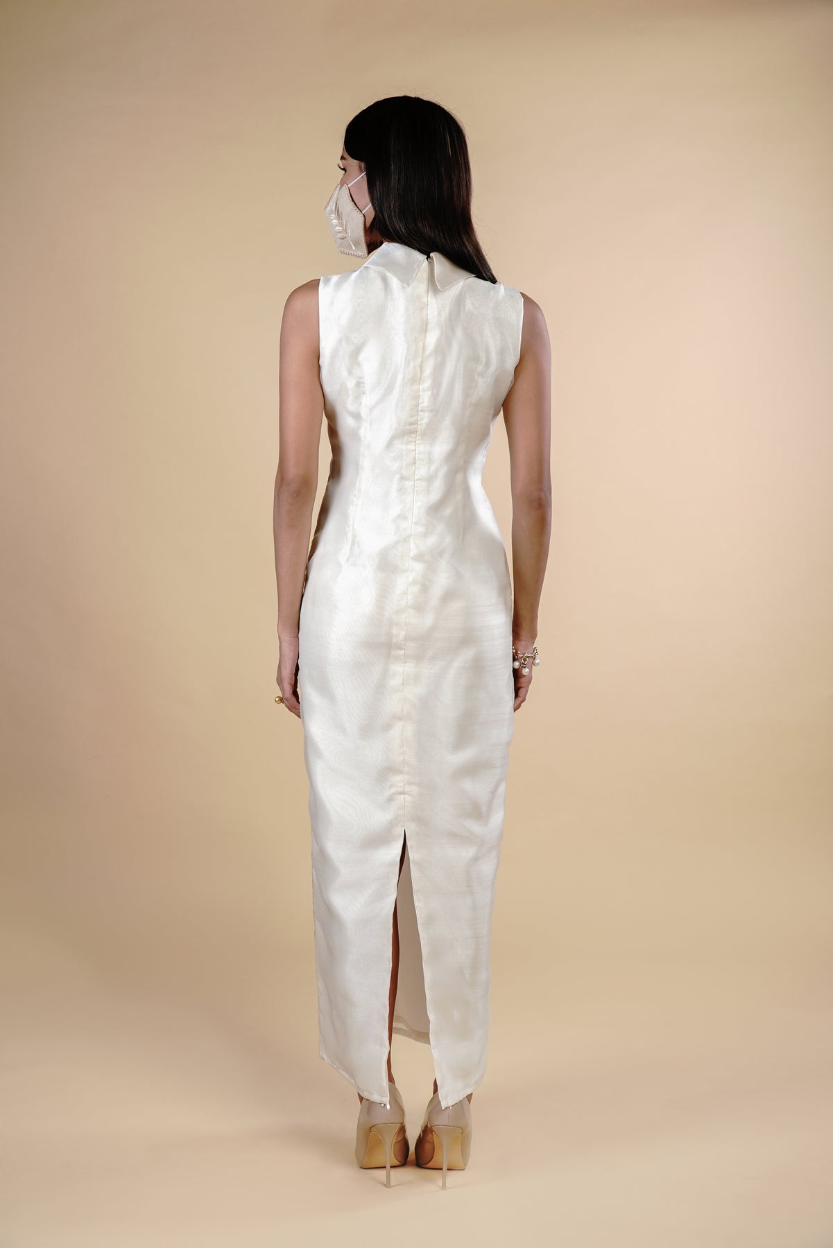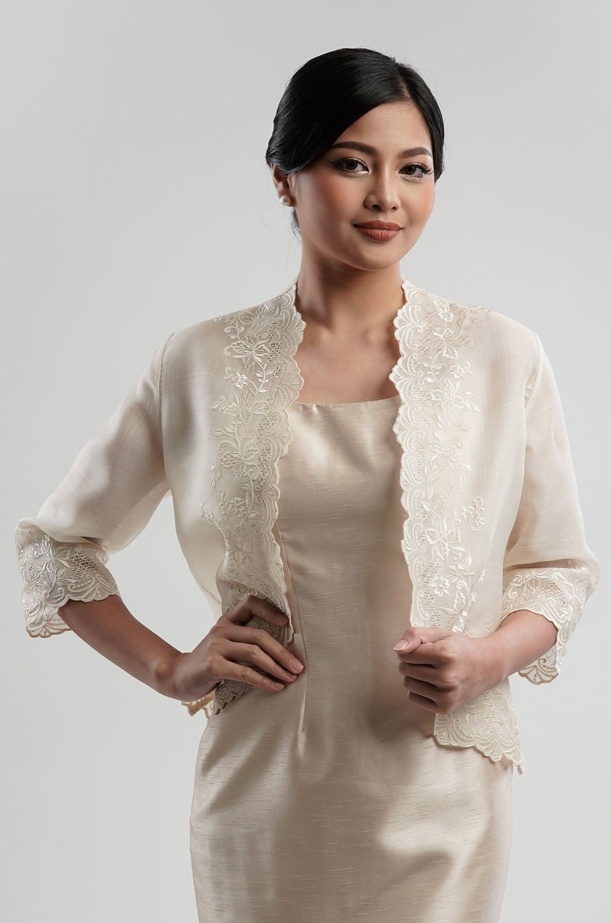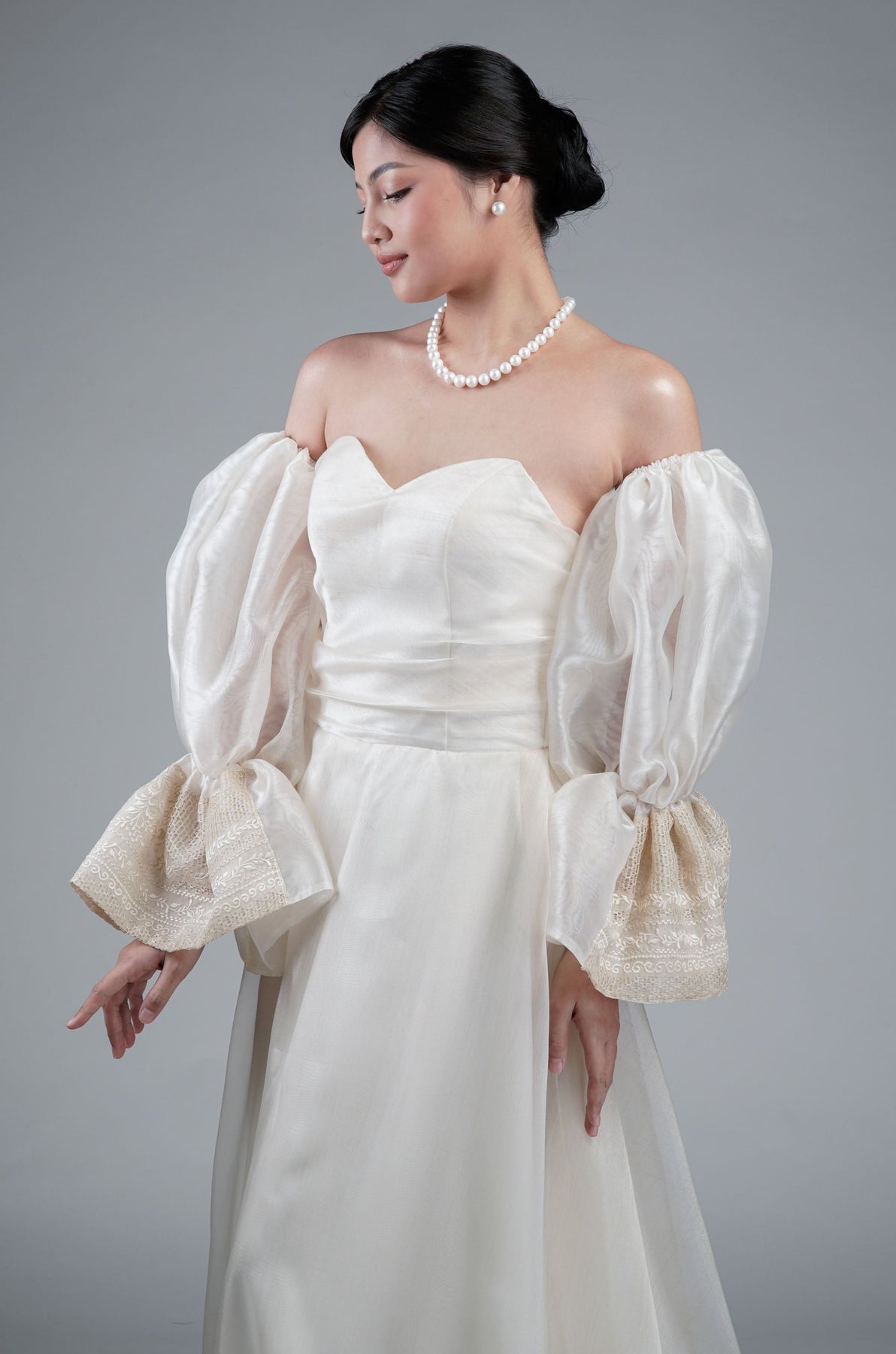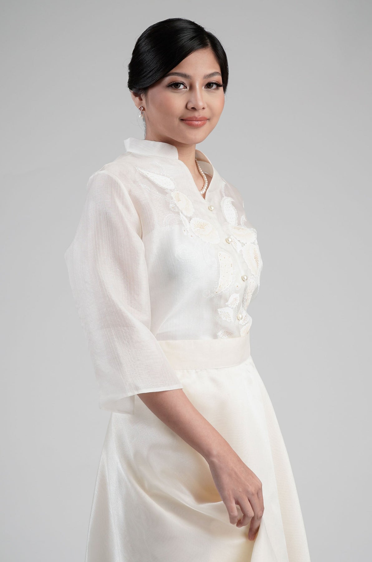 I wore the ivory colored shanthng dress during my wedding day! It was form fitting and had a nice hug at the waist area. Dress is not heavy, and I had comfort wearing it the whole day. Gown was long, as I stand 5'1", I wore a 3in heels and the hem falls slightly touching the floor.