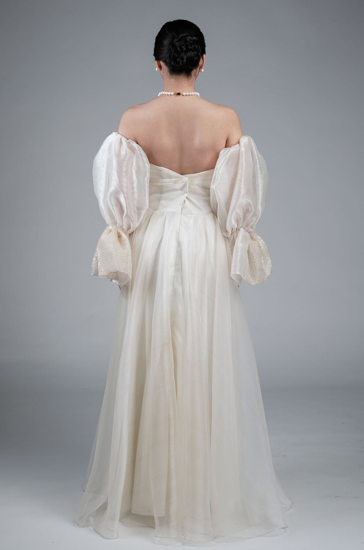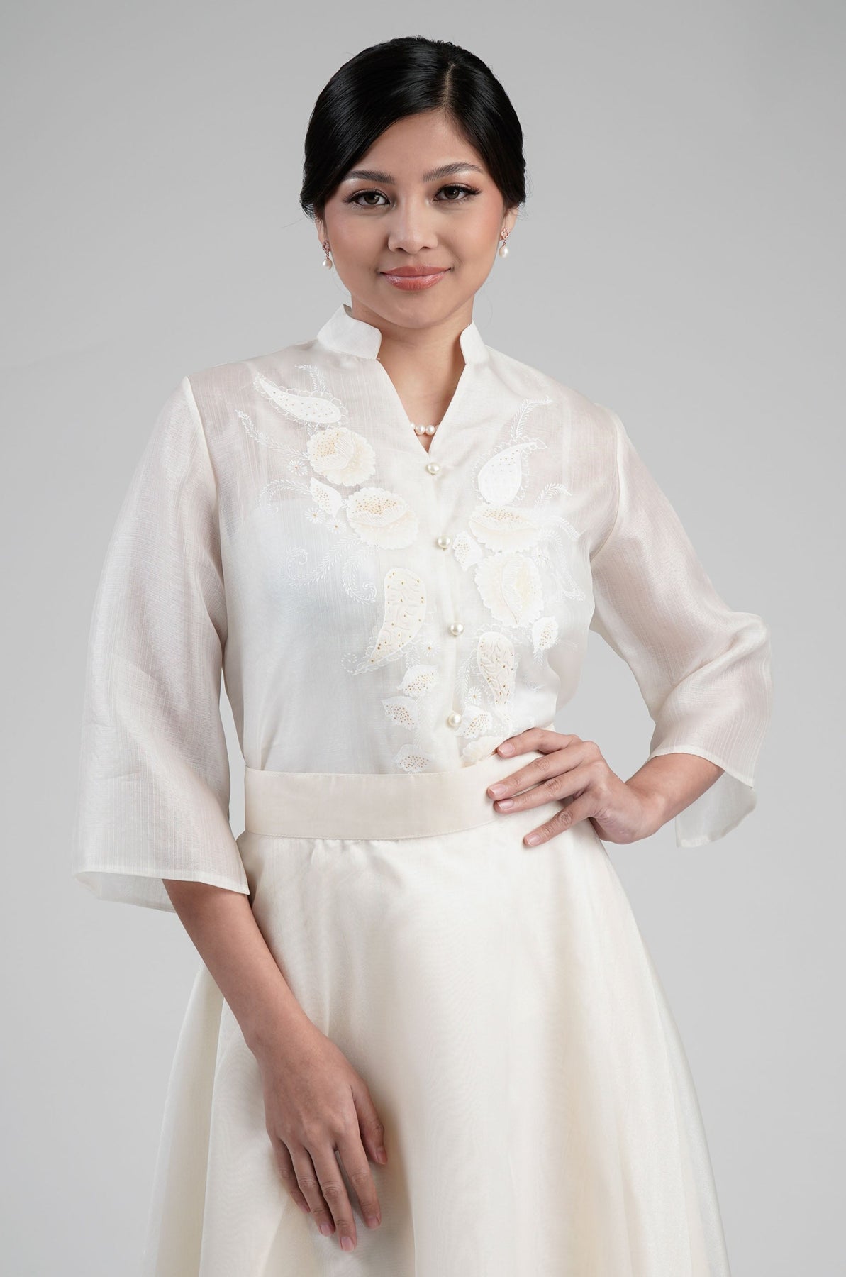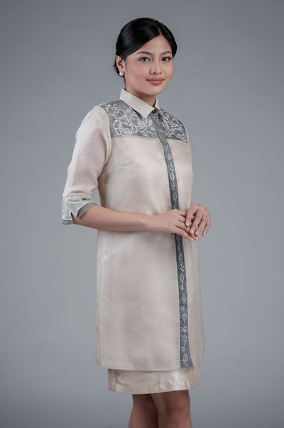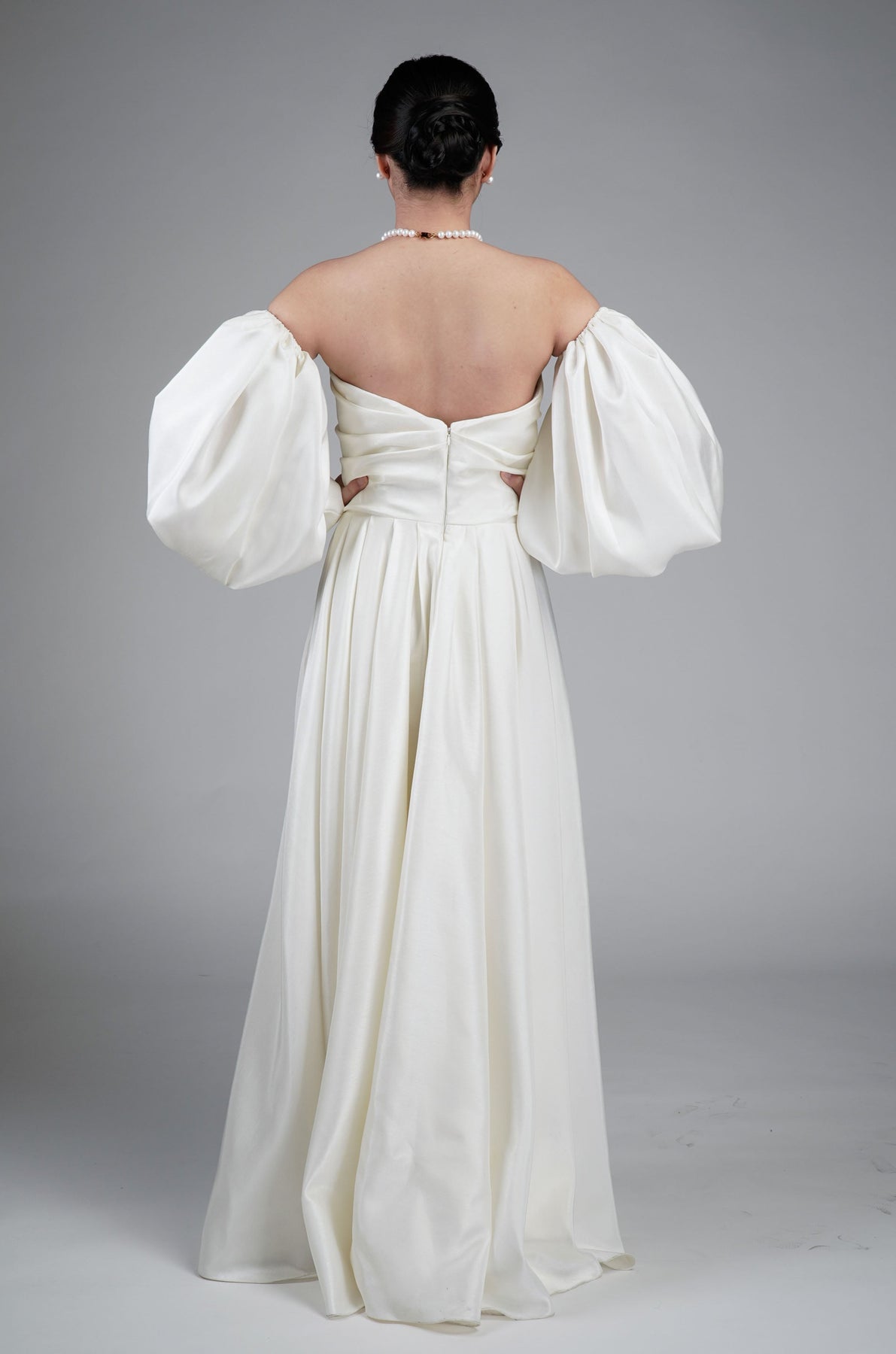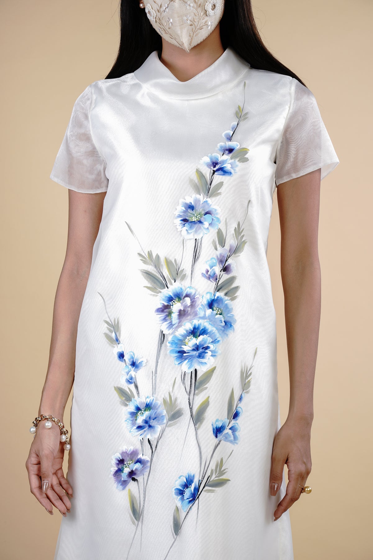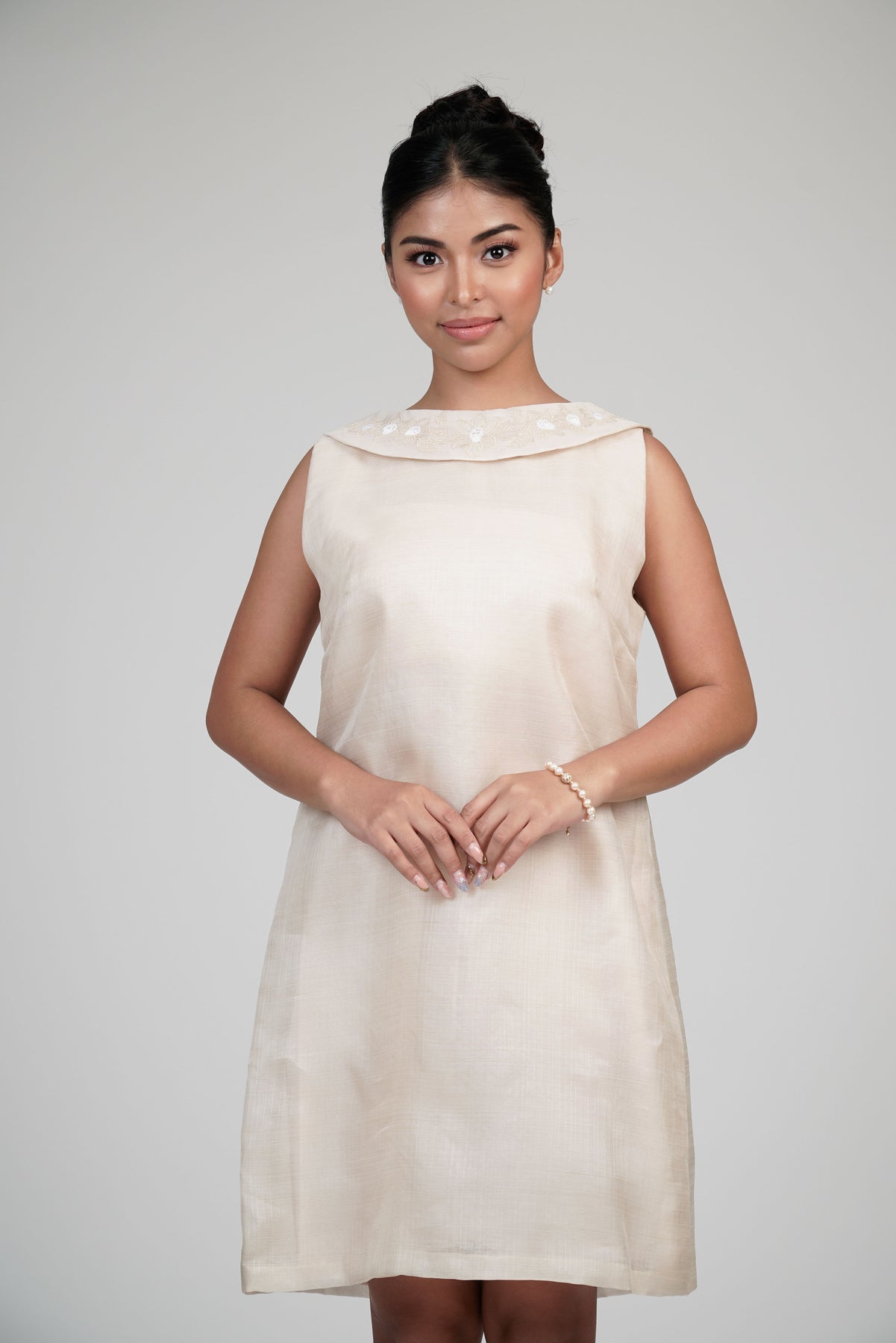 I wore the ivory colored shanthng dress during my wedding day! It was form fitting and had a nice hug at the waist area. Dress is not heavy, and I had comfort wearing it the whole day. Gown was long, as I stand 5'1", I wore a 3in heels and the hem falls slightly touching the floor.