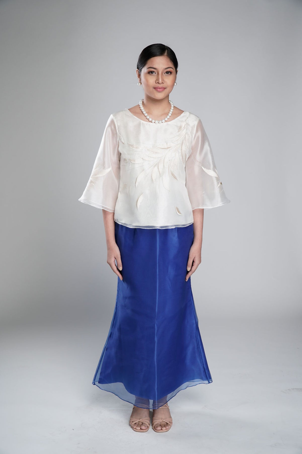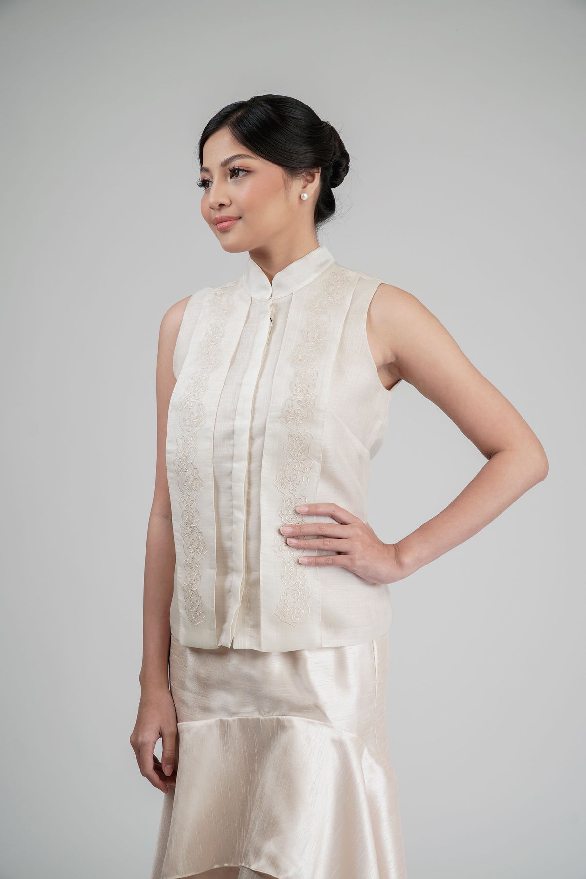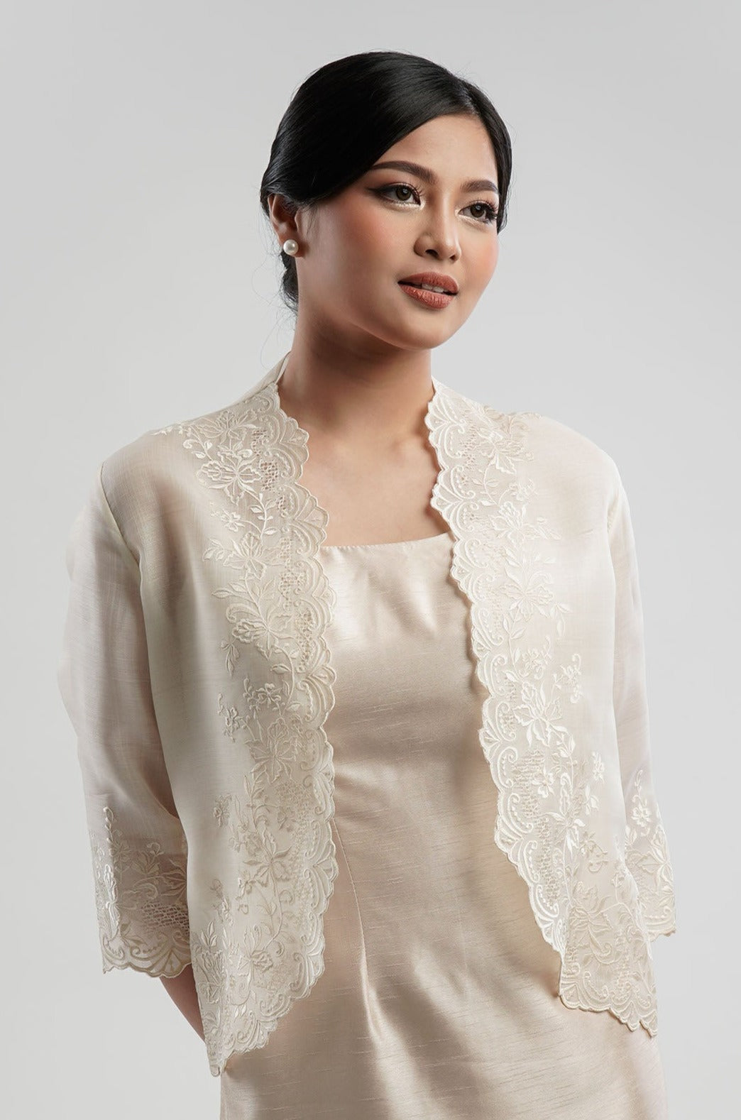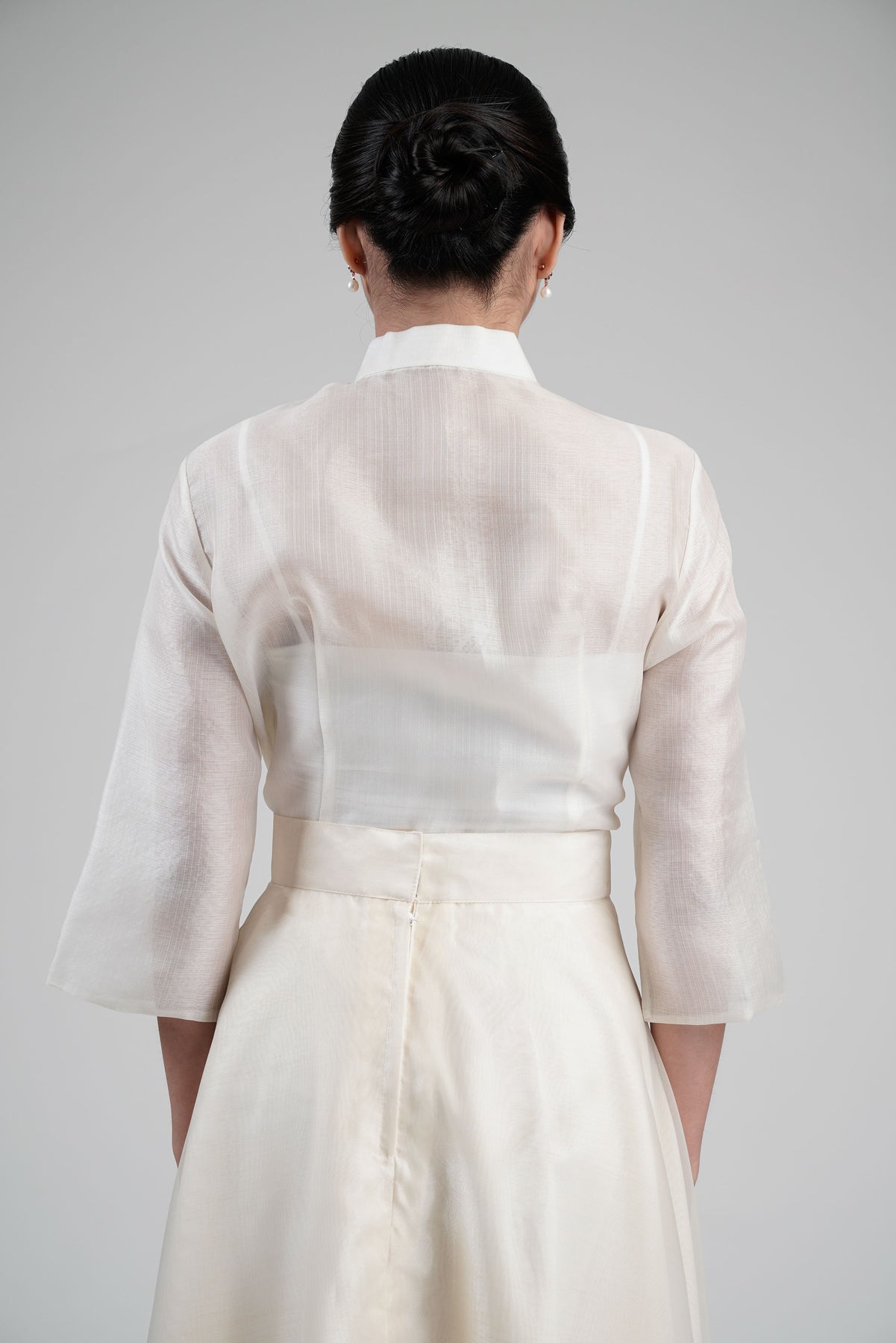I wore the ivory colored shanthng dress during my wedding day! It was form fitting and had a nice hug at the waist area. Dress is not heavy, and I had comfort wearing it the whole day. Gown was long, as I stand 5'1", I wore a 3in heels and the hem falls slightly touching the floor.