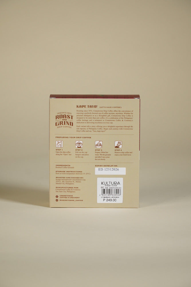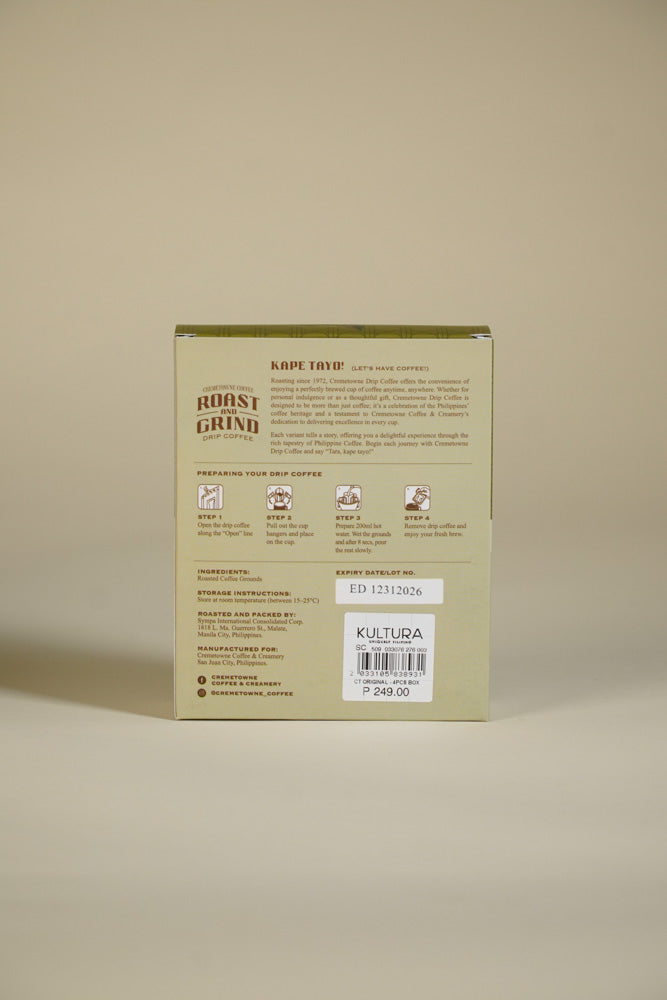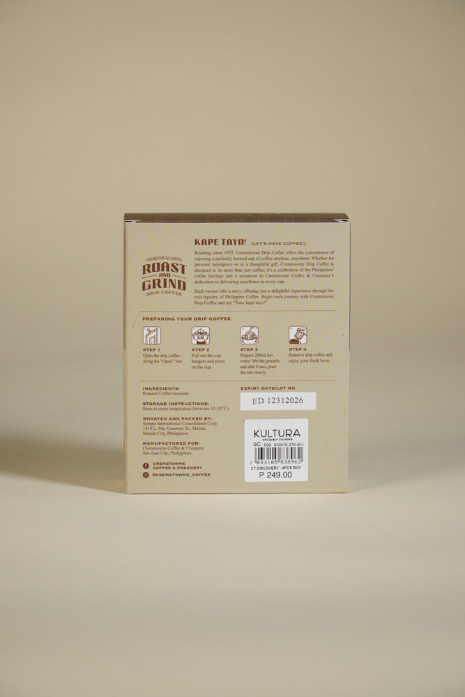 [{"id":47591657373951,"title":"Original blend","option1":"Original blend","option2":null,"option3":null,"sku":"10583893","requires_shipping":true,"taxable":true,"featured_image":{"id":47226292240639,"product_id":9280317718783,"position":1,"created_at":"2025-11-26T13:56:21+08:00","updated_at":"2025-11-26T13:56:23+08:00","alt":null,"width":667,"height":1000,"src":"\/\/www.kulturafilipino.com\/cdn\/shop\/files\/IMG1086.jpg?v=1764136583","variant_ids":[47591657373951]},"available":true,"name":"Cremetowne Roast and Grind Drip Coffee - Original blend","public_title":"Original blend","options":["Original blend"],"price":24900,"weight":710,"compare_at_price":null,"inventory_management":"shopify","barcode":"","featured_media":{"alt":null,"id":38626914238719,"position":1,"preview_image":{"aspect_ratio":0.667,"height":1000,"width":667,"src":"\/\/www.kulturafilipino.com\/cdn\/shop\/files\/IMG1086.jpg?v=1764136583"}},"requires_selling_plan":false,"selling_plan_allocations":[]},{"id":47591657406719,"title":"Barako","option1":"Barako","option2":null,"option3":null,"sku":"10583894","requires_shipping":true,"taxable":true,"featured_image":{"id":47226360135935,"product_id":9280317718783,"position":4,"created_at":"2025-11-26T14:32:48+08:00","updated_at":"2025-11-26T14:33:04+08:00","alt":null,"width":667,"height":1000,"src":"\/\/www.kulturafilipino.com\/cdn\/shop\/files\/IMG1095.jpg?v=1764138784","variant_ids":[47591657406719]},"available":true,"name":"Cremetowne Roast and Grind Drip Coffee - Barako","public_title":"Barako","options":["Barako"],"price":24900,"weight":710,"compare_at_price":null,"inventory_management":"shopify","barcode":"","featured_media":{"alt":null,"id":38626978169087,"position":4,"preview_image":{"aspect_ratio":0.667,"height":1000,"width":667,"src":"\/\/www.kulturafilipino.com\/cdn\/shop\/files\/IMG1095.jpg?v=1764138784"}},"requires_selling_plan":false,"selling_plan_allocations":[]},{"id":47591657439487,"title":"Arabica","option1":"Arabica","option2":null,"option3":null,"sku":"10583892","requires_shipping":true,"taxable":true,"featured_image":{"id":47226362069247,"product_id":9280317718783,"position":7,"created_at":"2025-11-26T14:34:22+08:00","updated_at":"2025-11-26T14:37:10+08:00","alt":null,"width":667,"height":1000,"src":"\/\/www.kulturafilipino.com\/cdn\/shop\/files\/IMG1093.jpg?v=1764139030","variant_ids":[47591657439487]},"available":true,"name":"Cremetowne Roast and Grind Drip Coffee - Arabica","public_title":"Arabica","options":["Arabica"],"price":24900,"weight":710,"compare_at_price":null,"inventory_management":"shopify","barcode":"","featured_media":{"alt":null,"id":38626980102399,"position":7,"preview_image":{"aspect_ratio":0.667,"height":1000,"width":667,"src":"\/\/www.kulturafilipino.com\/cdn\/shop\/files\/IMG1093.jpg?v=1764139030"}},"requires_selling_plan":false,"selling_plan_allocations":[]},{"id":47591657472255,"title":"Discovery set","option1":"Discovery set","option2":null,"option3":null,"sku":"10583896","requires_shipping":true,"taxable":true,"featured_image":{"id":47226368295167,"product_id":9280317718783,"position":10,"created_at":"2025-11-26T14:35:33+08:00","updated_at":"2025-11-26T14:37:10+08:00","alt":null,"width":667,"height":1000,"src":"\/\/www.kulturafilipino.com\/cdn\/shop\/files\/IMG1091.jpg?v=1764139030","variant_ids":[47591657472255]},"available":true,"name":"Cremetowne Roast and Grind Drip Coffee - Discovery set","public_title":"Discovery set","options":["Discovery set"],"price":24900,"weight":710,"compare_at_price":null,"inventory_management":"shopify","barcode":"","featured_media":{"alt":null,"id":38626985771263,"position":10,"preview_image":{"aspect_ratio":0.667,"height":1000,"width":667,"src":"\/\/www.kulturafilipino.com\/cdn\/shop\/files\/IMG1091.jpg?v=1764139030"}},"requires_selling_plan":false,"selling_plan_allocations":[]},{"id":48071419887871,"title":"Manila Blend","option1":"Manila Blend","option2":null,"option3":null,"sku":"10583895","requires_shipping":true,"taxable":true,"featured_image":null,"available":true,"name":"Cremetowne Roast and Grind Drip Coffee - Manila Blend","public_title":"Manila Blend","options":["Manila Blend"],"price":24900,"weight":710,"compare_at_price":null,"inventory_management":"shopify","barcode":"","requires_selling_plan":false,"selling_plan_allocations":[]}]