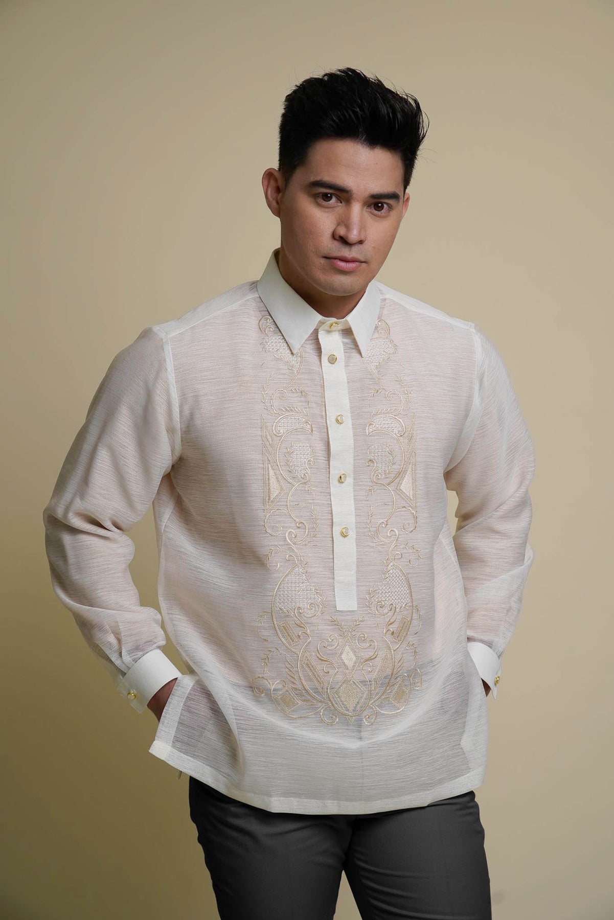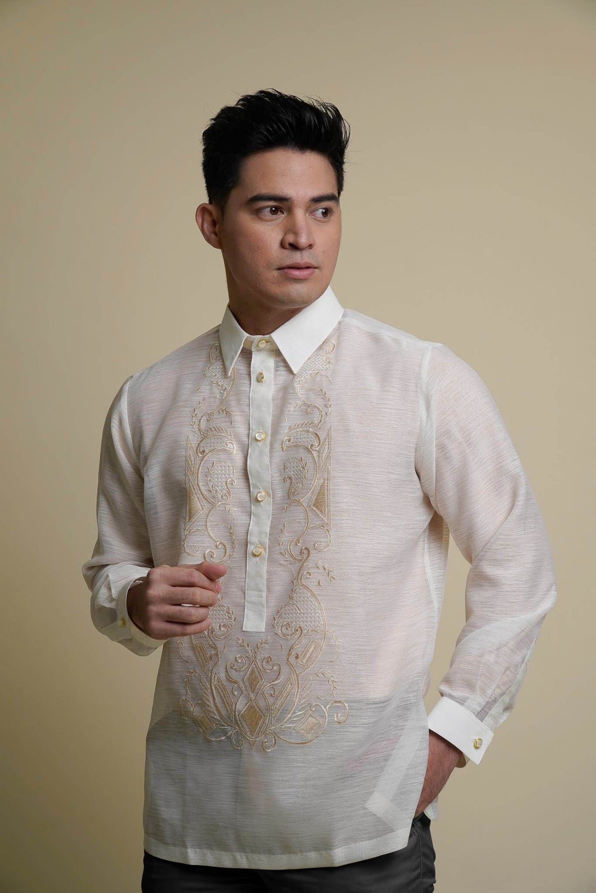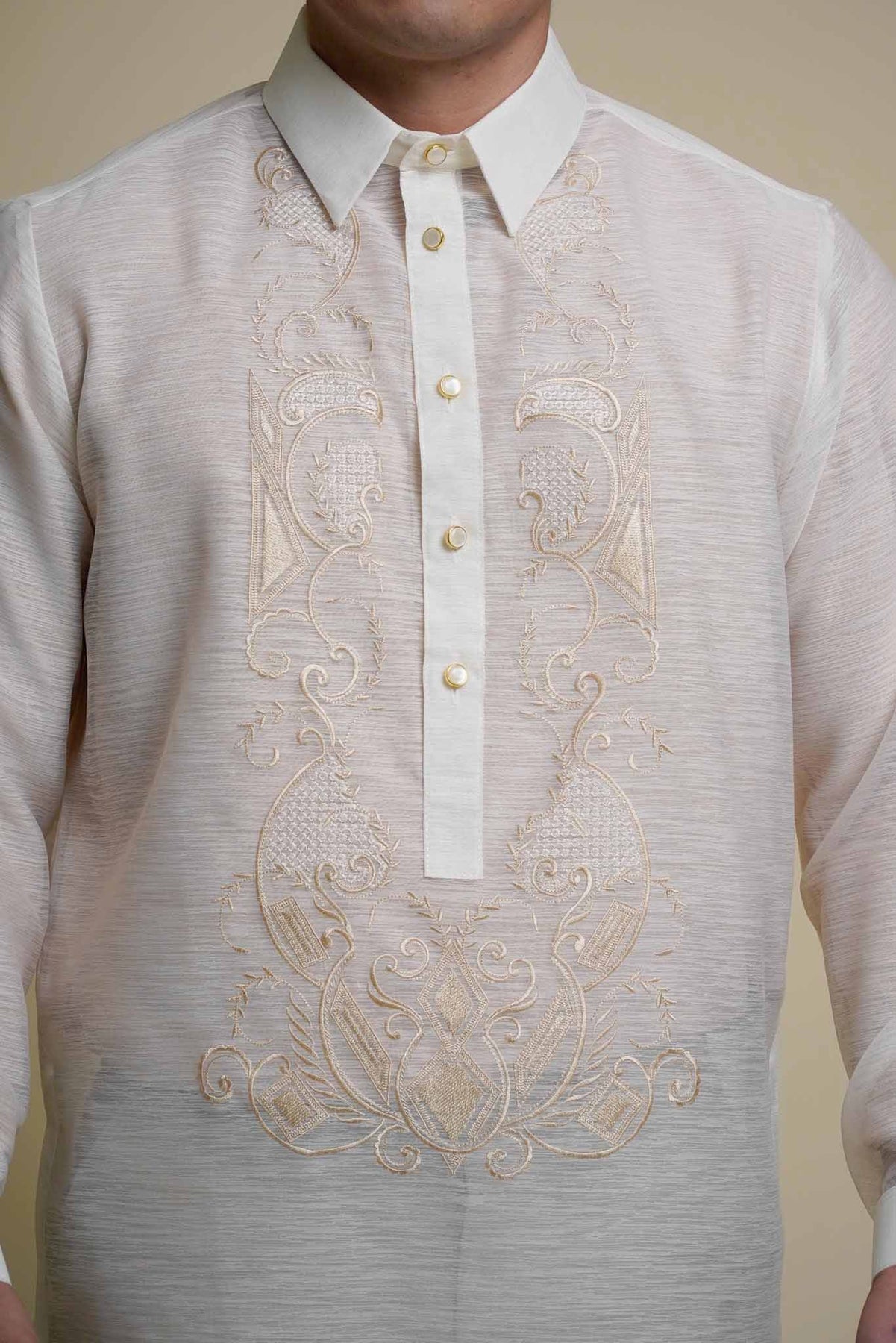 With embroidery details on the front, full-collar half-button long sleeve barong