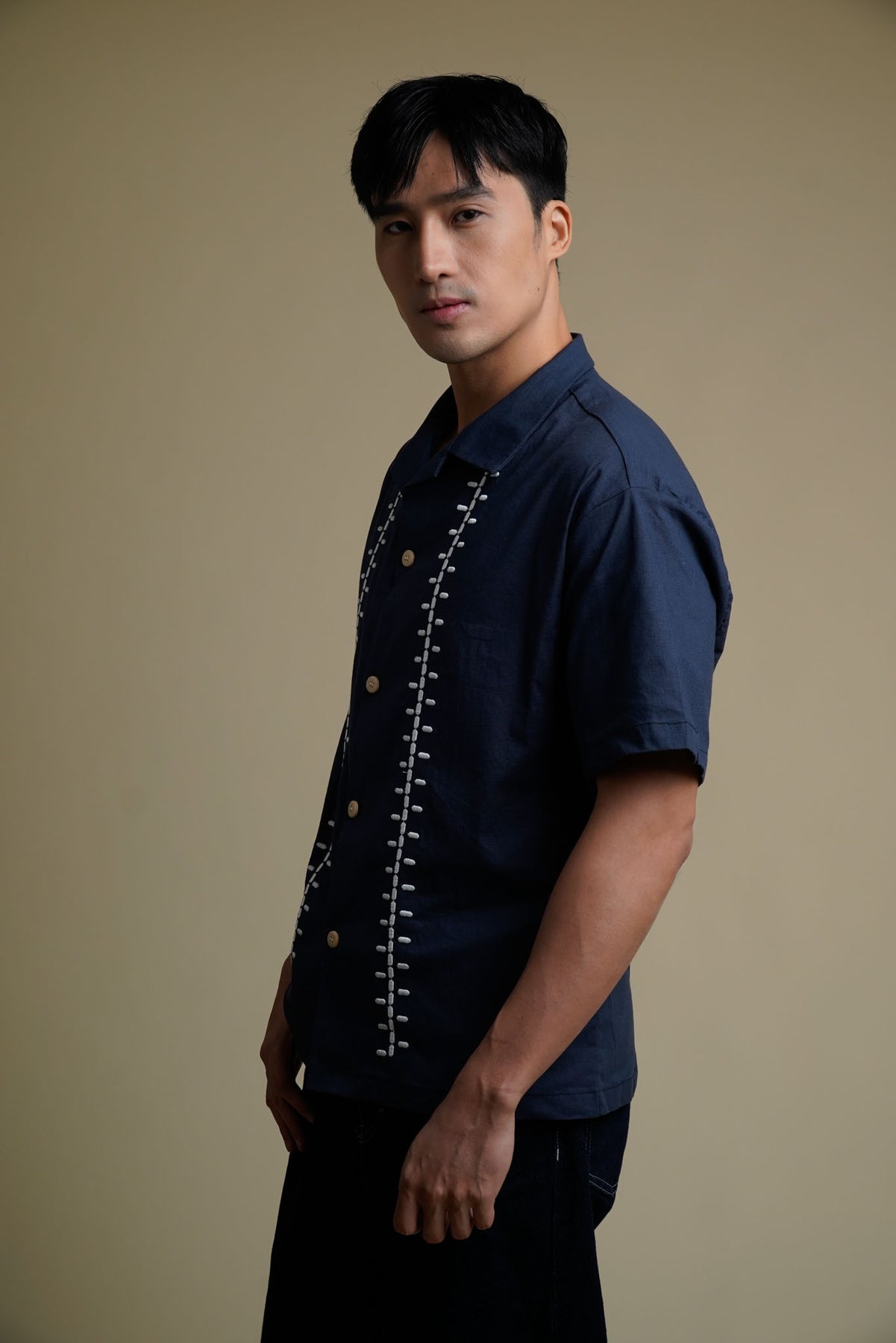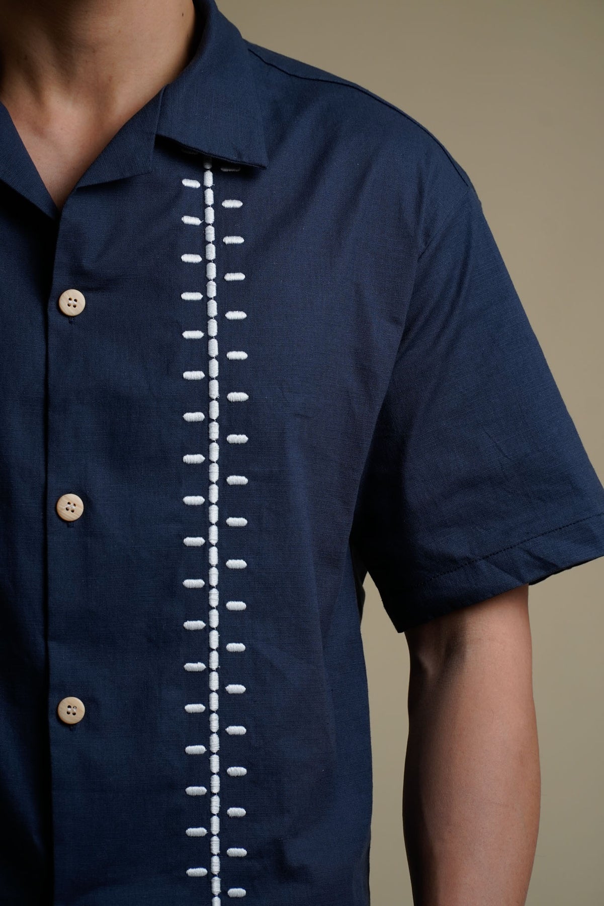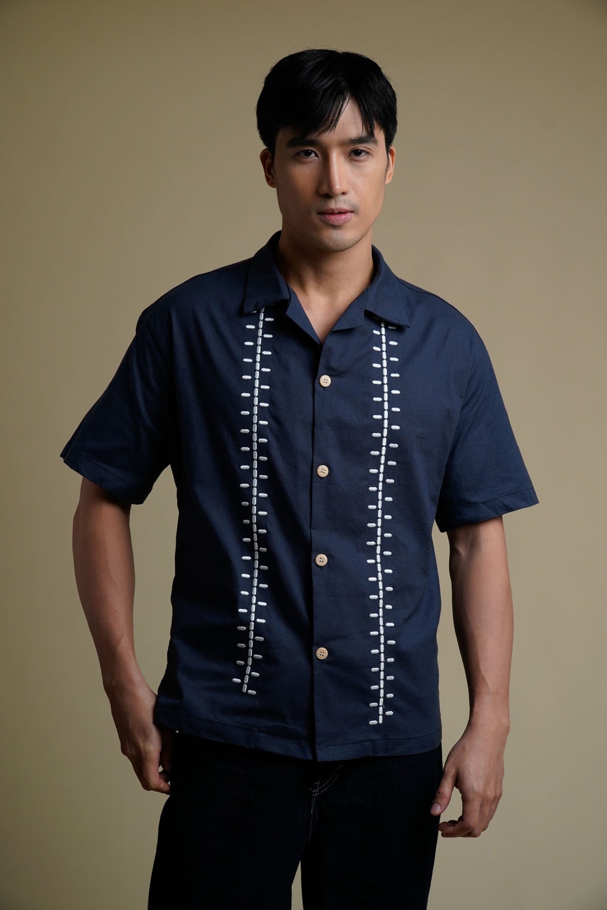 Men's Linen Polo with Ladder Embroidery in Navy Blue